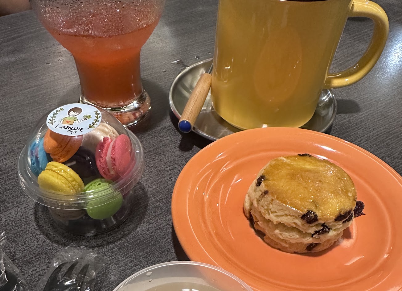 我們今天點豬排蕈菇義大利麵和日式唐揚雞風味餐兩個套餐,豬排和唐揚雞的肉都鮮嫩多汁,義大利麵我覺得很好吃?我們還點了台式豬血糕、波波蝦球和甜不辣,點的太多吃不完,幸好可以打包。甜點的部分有馬卡龍、原味司康和雪梨桂花凍,我個人很喜歡司康。