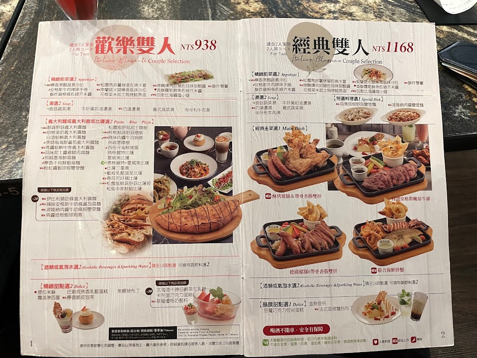 松露起司蛋佛卡夏, 酥皮玉米濃湯, 松露風野菇起司燉飯, 雞腿, 韓式辣味牛肉佐綠探戈菜, 炸薯條, 墨魚燉飯, 明太子雙鮮義大利圓麵, 伯爵茶戚風蛋糕, 炸鮮魚, 特選安格斯嫩煎牛排, 焦糖布丁, 雙人 套餐, 海鮮燉飯, 提拉米蘇, 白酒蛤蜊義大利圓麵, 牛肝菌奶油濃湯, 匈牙利牛肉湯, 核桃鮮蔬野菇燉飯, 烏賊墨扁麵