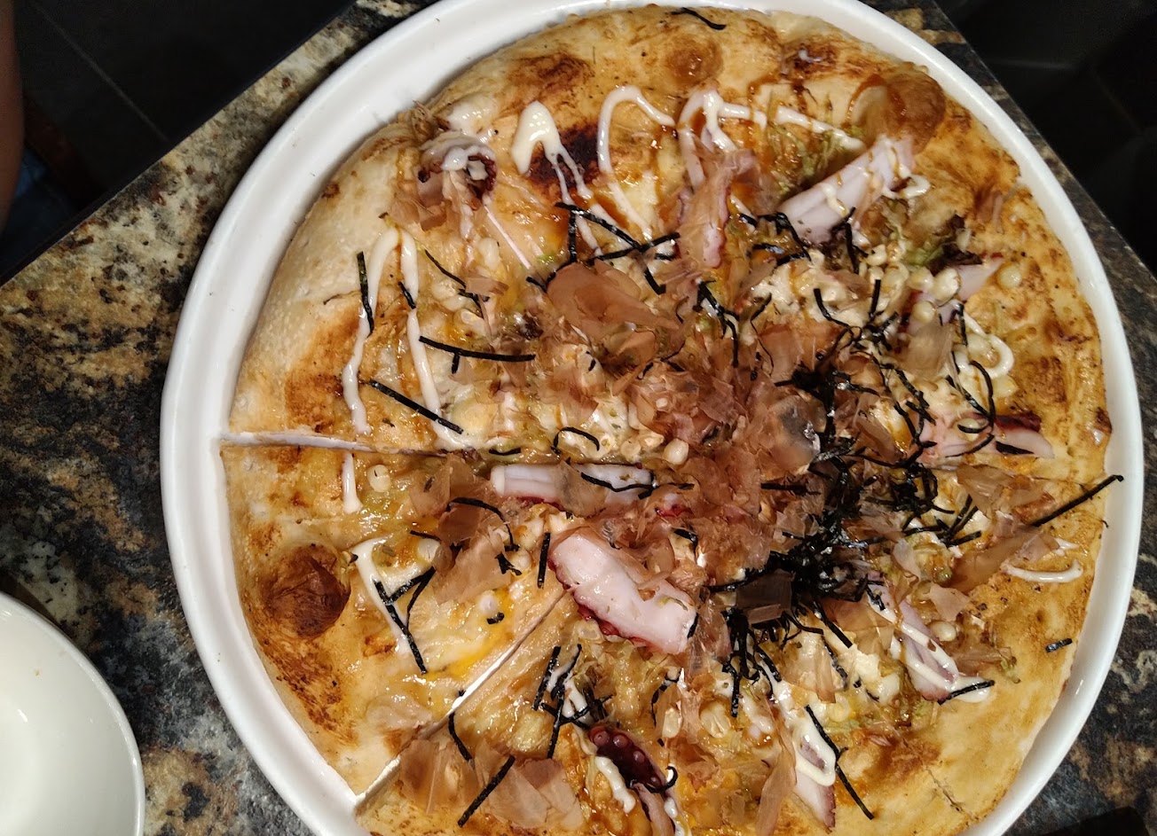 店員蠻可愛的,因為比薩烤壞,所以還多送我們一份蒜香烤雞肉?(好誠實) …