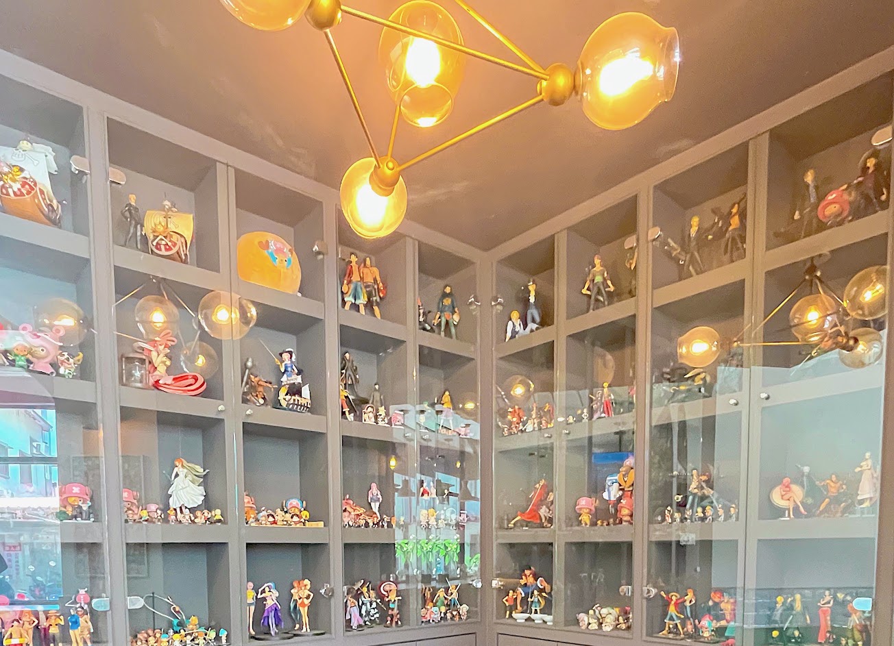 但一轉身旋即來到另一個世界——整面的玻璃櫃牆收藏著大量公仔模型,大部分都是航海王的收藏,數量之多又擺放整齊讓人忍不住駐足拍照欣賞。另一旁的書櫃則是完整收藏了全套漫畫,可見老闆的喜愛與熱情。