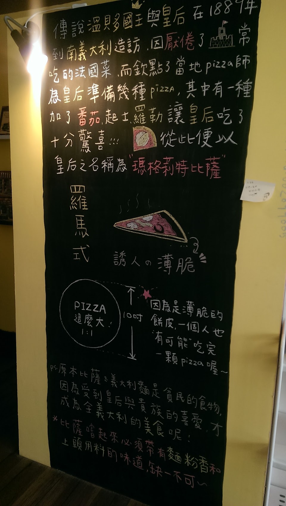 進口原料,對於品質要求不打折,黑板上面特別介紹瑪格莉特比薩的由來,正好也是我最愛手工窯烤的口味,當然不放過這款經典口味,趁熱吃才能品嚐薄、脆、香、酥!
