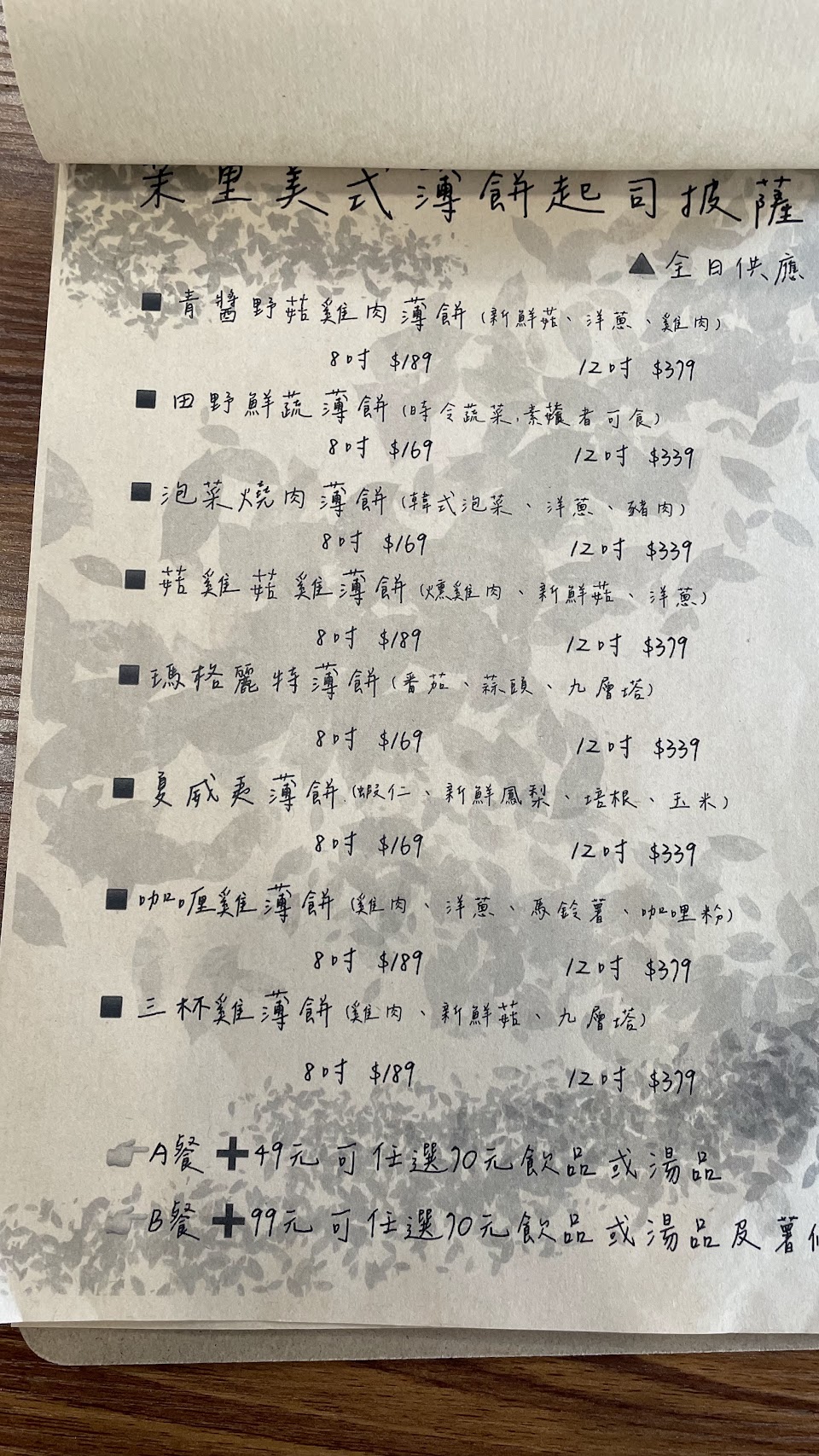 青醬野菇雞肉薄餅(8吋)$130