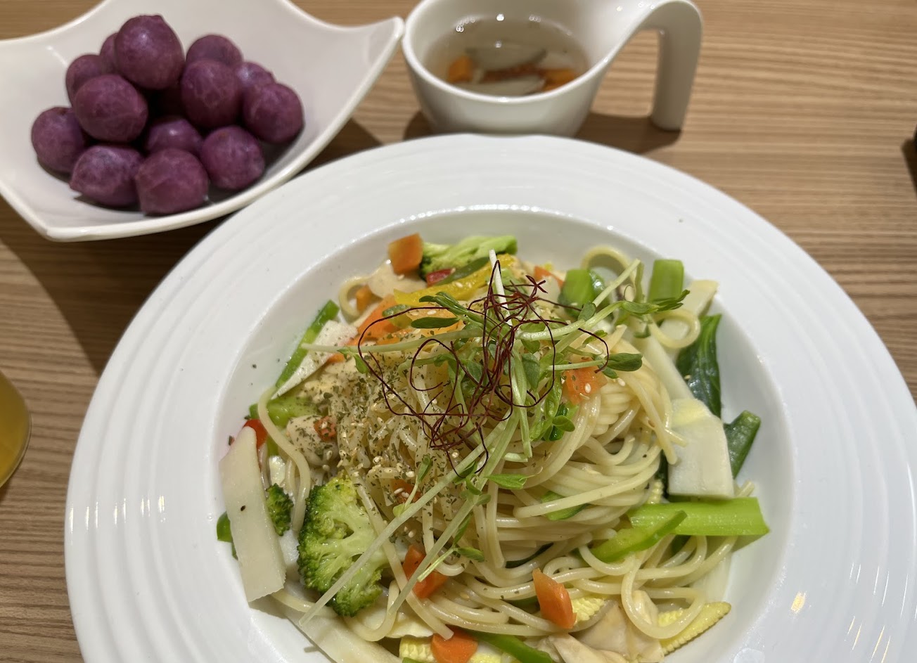 偶然路過發現的好食素食餐廳,好吃的蔬食料理,沒有素料,滿滿的蔬菜用料,擺盤配色很有質感,提供配餐甜湯也是用料滿滿,紅豆薏仁很好入口,能感受老闆的用心,連孩子也很捧場,老闆很親切,一人出餐速度也頗快,用完餐老闆還送了一顆有機栽種的柚子,希望下次還有機會再來用餐。