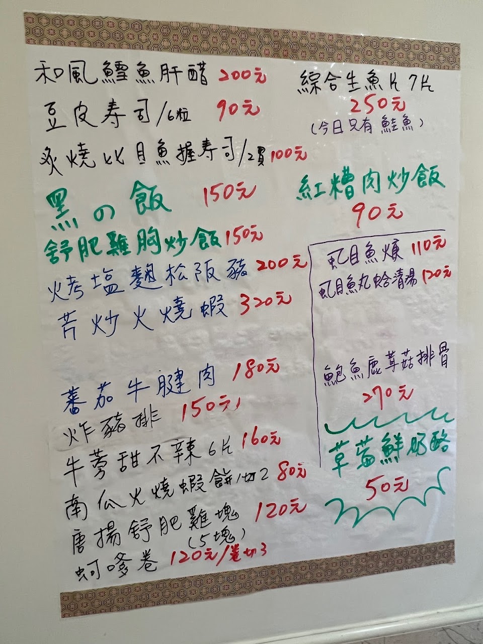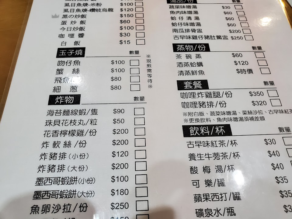 非假日中午的用餐,電話訂位老闆娘就告知出菜會比較慢,11:30才開始營業,當天內用僅三桌+幾個外帶,有名的黑炒飯在點餐時就被詢問…三桌+外帶的炒飯一起炒,點餐好了老闆娘會到桌邊確認,並說明哪些菜還有沒有(綜合生魚片只剩下鮭魚),雖然只有一位主廚,因為只有三桌,所以出菜慢感覺還好;一開始送上毛豆當開胃菜,口味清淡;黑炒飯吃比看起來清淡很多,份量少(比一個便當盒份量還少),或許是黑蒜頭,還是炒過頭,吃到喉嚨還會有一股焦味,自己沒有很喜歡;虱目魚羹自己做的,吃過最少的魚腥味,咬下可以看到完整的魚肉,好吃!海膽豆腐份量小,裡面包魚卵,很有口感好吃!炙燒比目魚壽司,入口即化,好吃!鮭魚生魚片大小適中、口感不錯!燒烤黑豬肉…小小一塊,沒有明顯的燒烤味,吃起來感覺普通!高麗菜心,清淡的口味;兩個人一共970,每個餐點份量不多,但這樣吃完有飽足感,停車方便對面旁邊都可以停