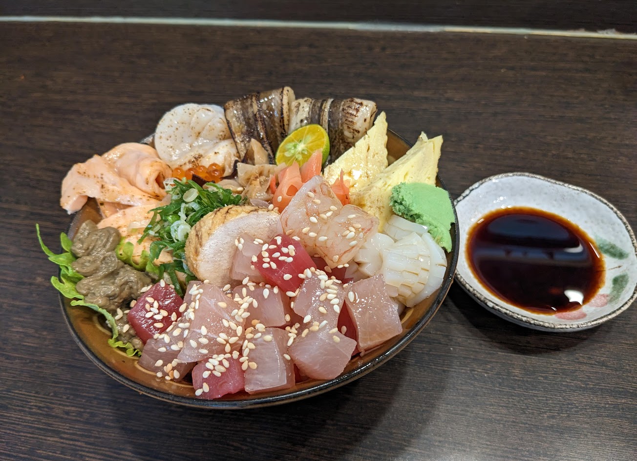 綜合生魚片丼飯,份量足夠、種類多樣,鮭魚.鮪魚.旗魚.干貝.甜蝦.北寄貝.花枝,鮮甜美味,醋飯恰到好處。