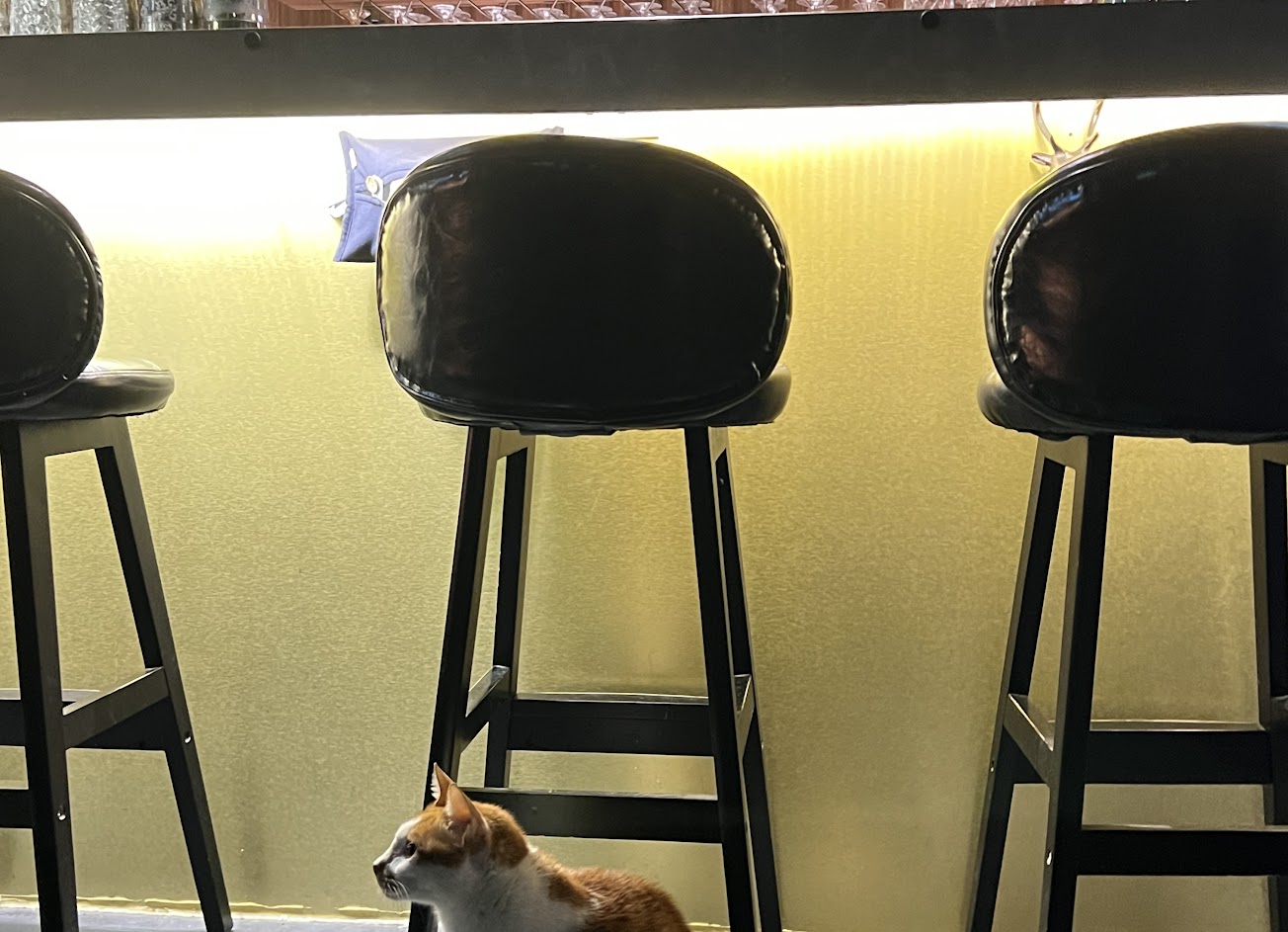 2023/12/16 夜晚小酌和吃宵夜。調酒師很專業,很用心調每一杯酒,色澤視覺效果都很引人入勝,杯子器皿也很有質感;也可以依客人喜好調整和推薦,當天跟同事相會,調酒師還招待大家喝shot,相當熱情友善。店門口開關很神秘,隱藏在石牆之間;裝潢氣氛昏暗,酒牆陳列許多酒,裡頭還有可愛的貓咪遊走,挺親人。