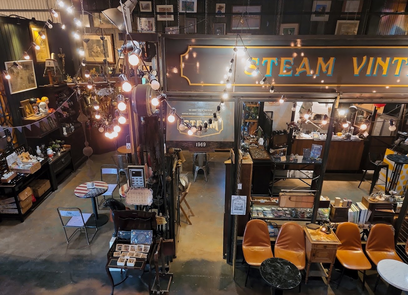 占地寬廣的倉庫空間,有由汽車零件製成的藝術品和家具,並設有異國美食餐廳。