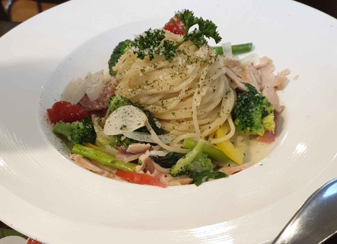 餐點普通,點了青醬野菇鮮蔬義大利麵,青醬味道淡,只有一根蘆筍、幾片甜椒、菇、幾朵花椰菜、很多生菜,生菜與義大利麵味道很不搭。