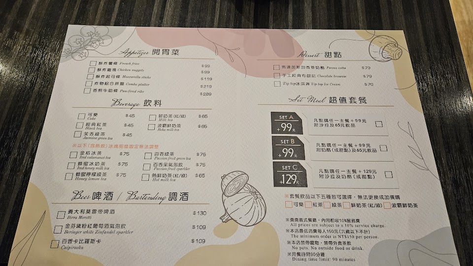 食物美味,氣氛輕鬆,希望飲料能提供加價更換的服務,鮮奶綠很好喝,但是同時搭配濃湯、奶酪會膩。