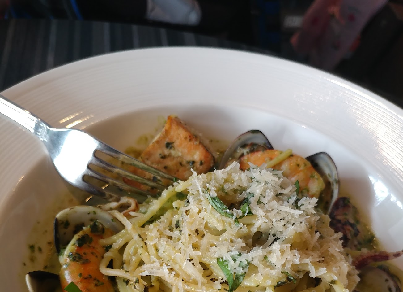 對我來說這是一次店,點了店員推薦但這上菜後發現是個不知道為什麼濕答答的辣椒雞肉披薩,還有看起來像湯麵的焗烤,青醬海鮮麵則是唯一不NG的主菜雖然也受到濕答答的湯麵樣。