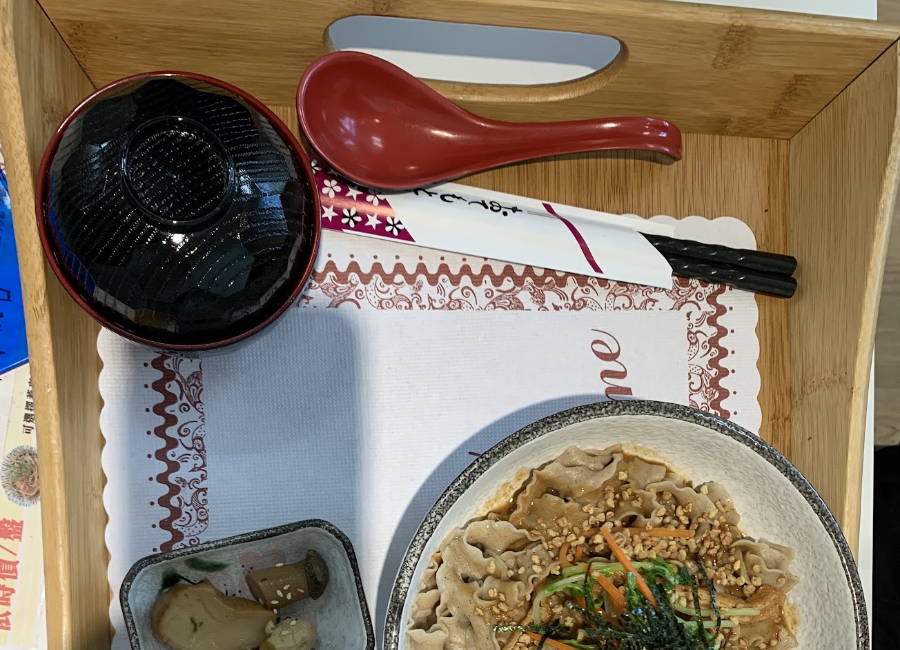 剛進餐廳時會經過他們樓下的蕎麥工廠,後來才到上面的餐廳,餐廳入口處有介紹跟伴手禮,進去後應該(?)會有人幫你帶位,可是我可能被遺忘了,是我自己去找店員的🥲🥲🥲,會有人跟你介紹餐點各個特色與配料,點完餐後要自行到櫃檯結帳,接下來就等食物上桌啦~~~🤗,不得不說餐點真的很好吃,蕎麥麵很有嚼勁跟彈牙,胡麻醬汁非常的香,會讓人情不自禁地一口接著一口,我吃到一半醬汁就見底了,跟店員問完醬汁似乎是可以續的,不過最後我沒有開口要第二碗醬汁😂😂😂,所以還請有人再試試看啦,唐揚炸雞外面裹的不是普通麵衣,而是有蕎麥的,比一般麵衣更酥脆且有額外的風味,非常好吃,前菜給的小點心也非常開胃,三兩口就吃光光了,旁邊也有賣整包裝的小點心,如果吃不夠也可以買,會是很好的伴手禮,除了位置比較遠旁邊沒什麼風景跟人潮眾多所以環境吵雜外,整體的餐點非常優秀!