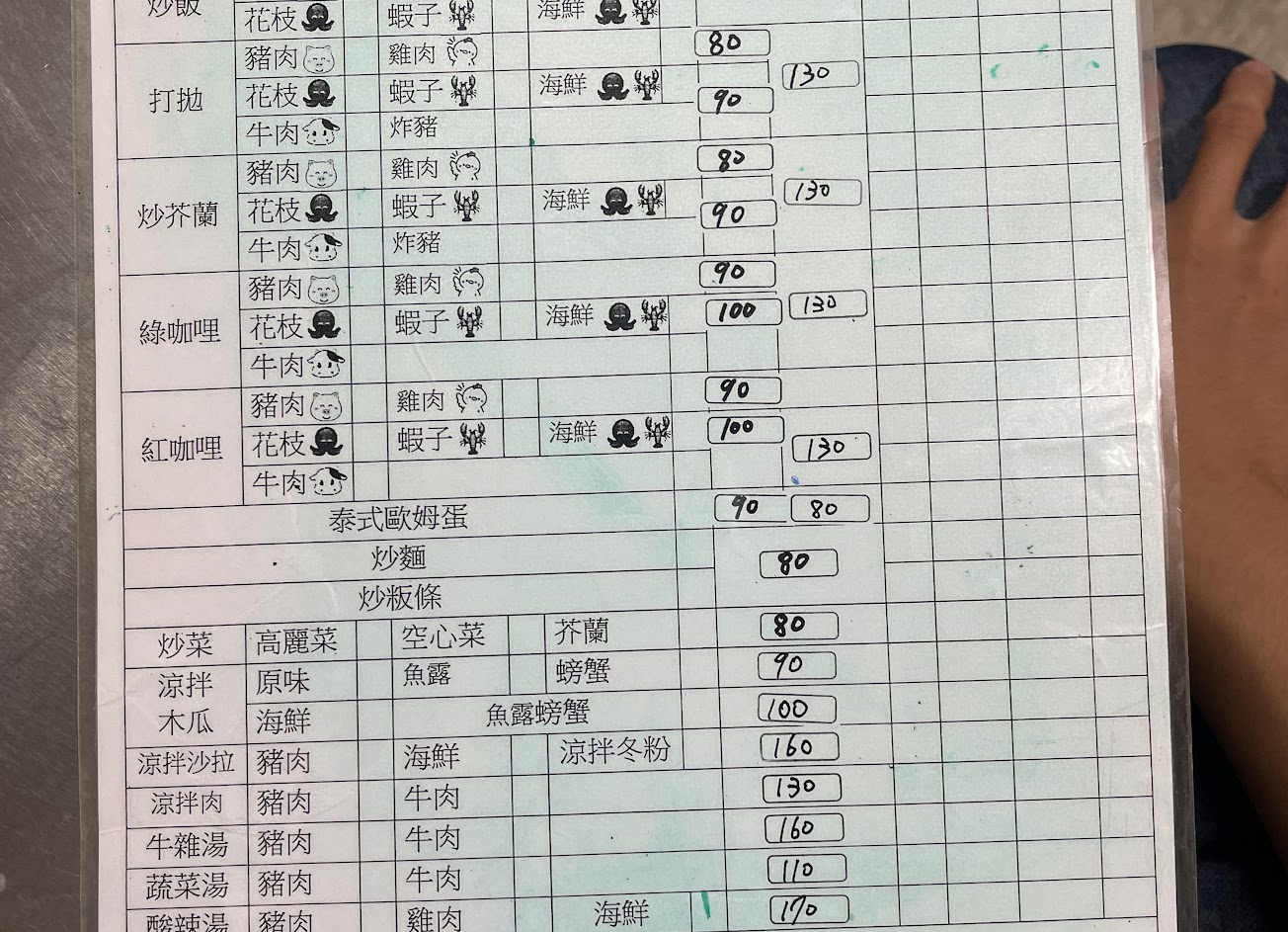 消費品項:打拋豬蓋飯$70、炒飯(豬)$80、泰式椒麻雞$150、酸辣海鮮湯$170