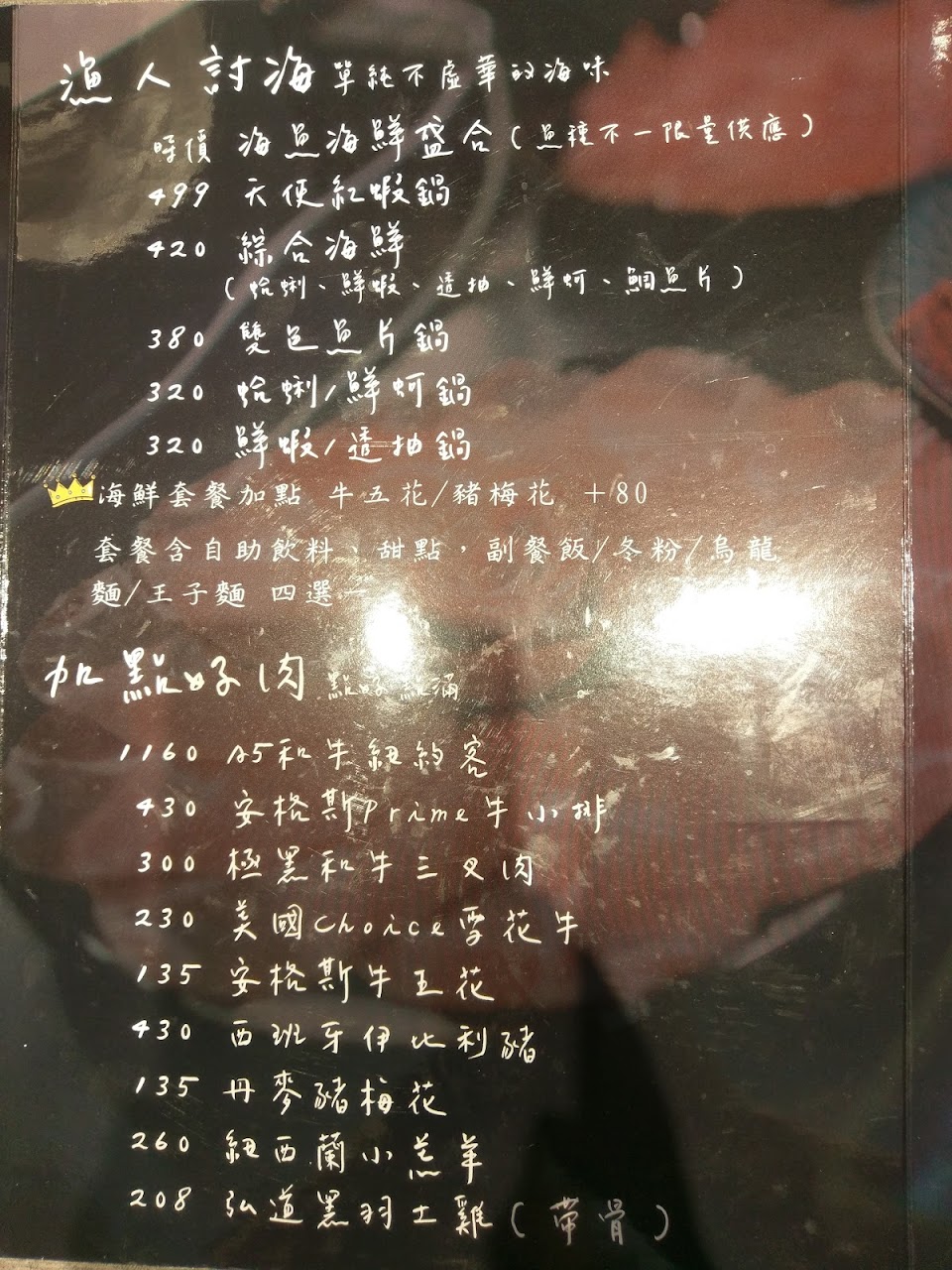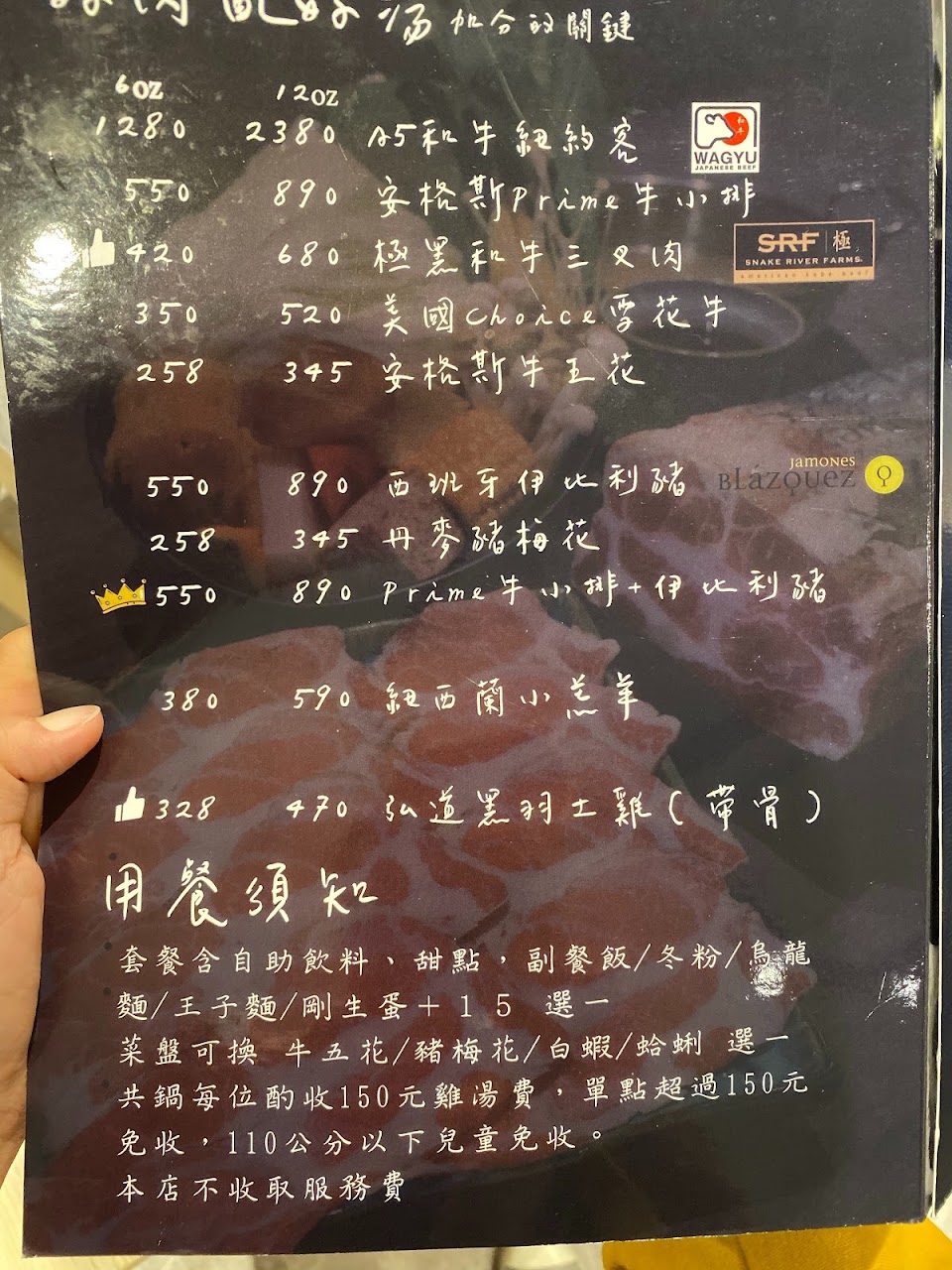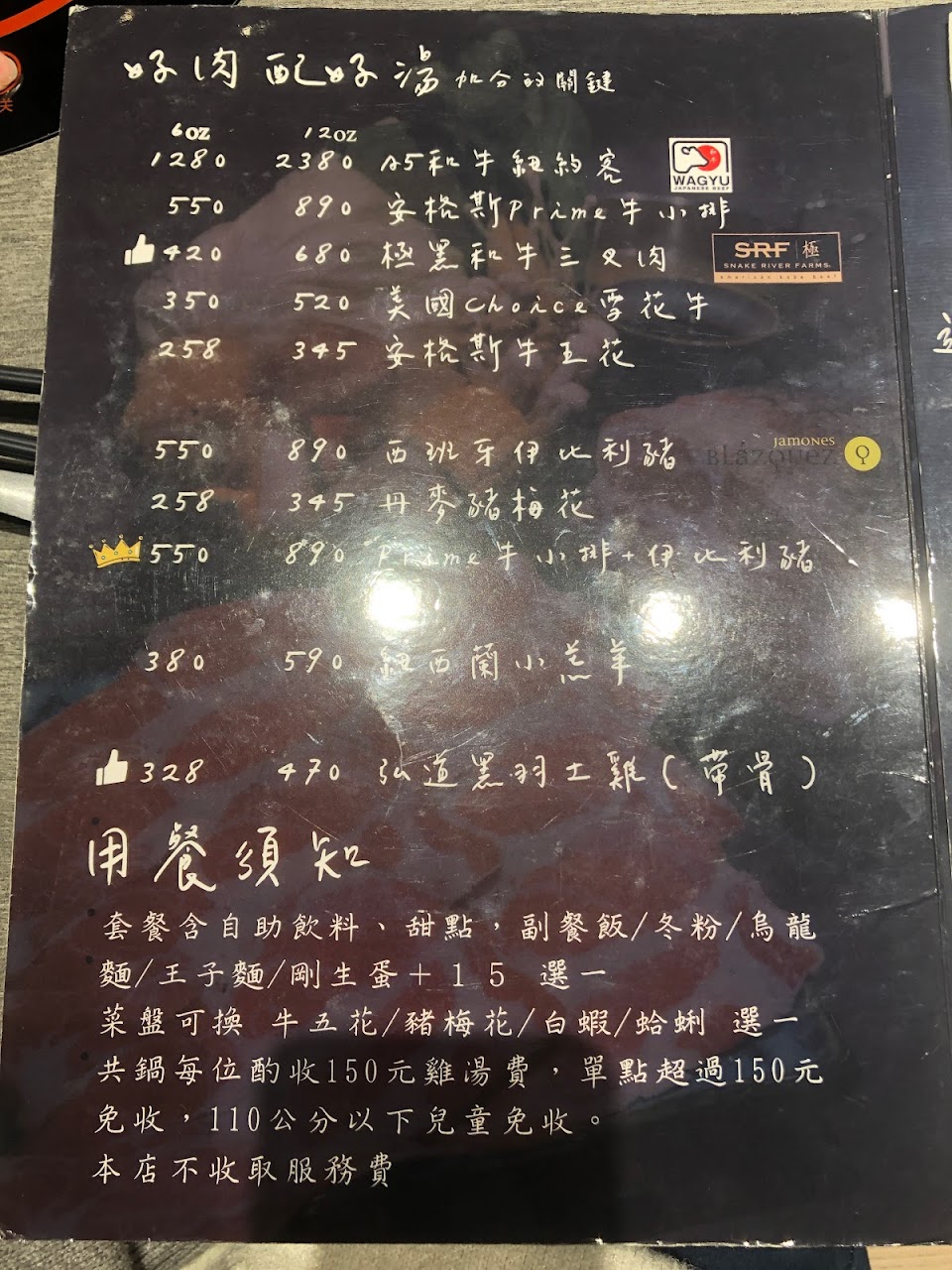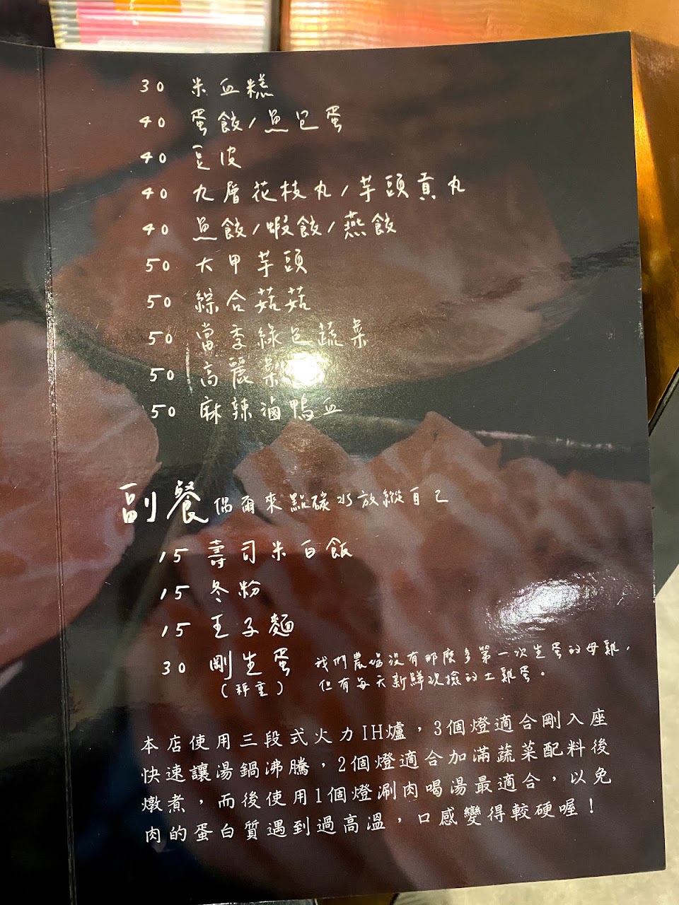 食材用的都不錯,肉品蔬菜都很新鮮,以原型食物為主,這點很棒,芋頭很好吃值得加點。當天點了牛肉12oz、豬五花、魚肉、土雞鍋,最喜歡魚片,牛五花次之,肉片切得很薄,個人可以覺得再厚一點點比較有肉感。土雞很甜但是相較之下就非常有嚼勁,需要牙口好一點的。有甜湯飲料自取。不可共鍋,每鍋大約300以上。可帶寵物但不可落地。