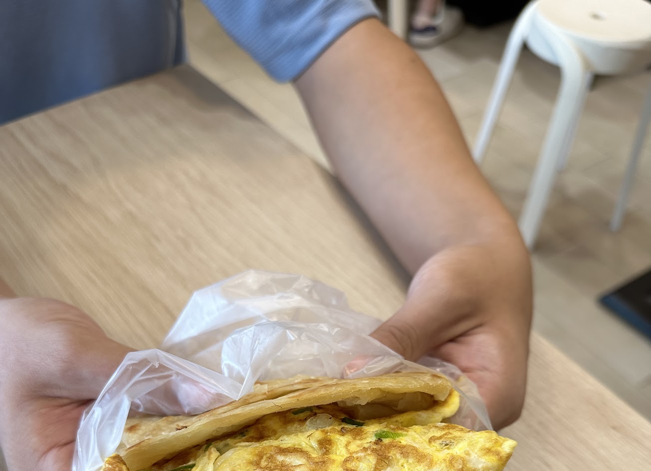 2023年11月12日, 我內用入座後, 服務生送上的現做蛋餅竟是裝在塑膠袋內的, 我指著另一桌客人用盤子盛裝的蛋餅提出疑問, 服務生竟回覆:「用塑膠袋裝比較環保。」那位極有禮貌的服務生另外告訴我, 如果我不喜歡的話, 他可以幫我改裝在盤子裡。(但是這不就平白浪費了一個塑膠袋嗎?)