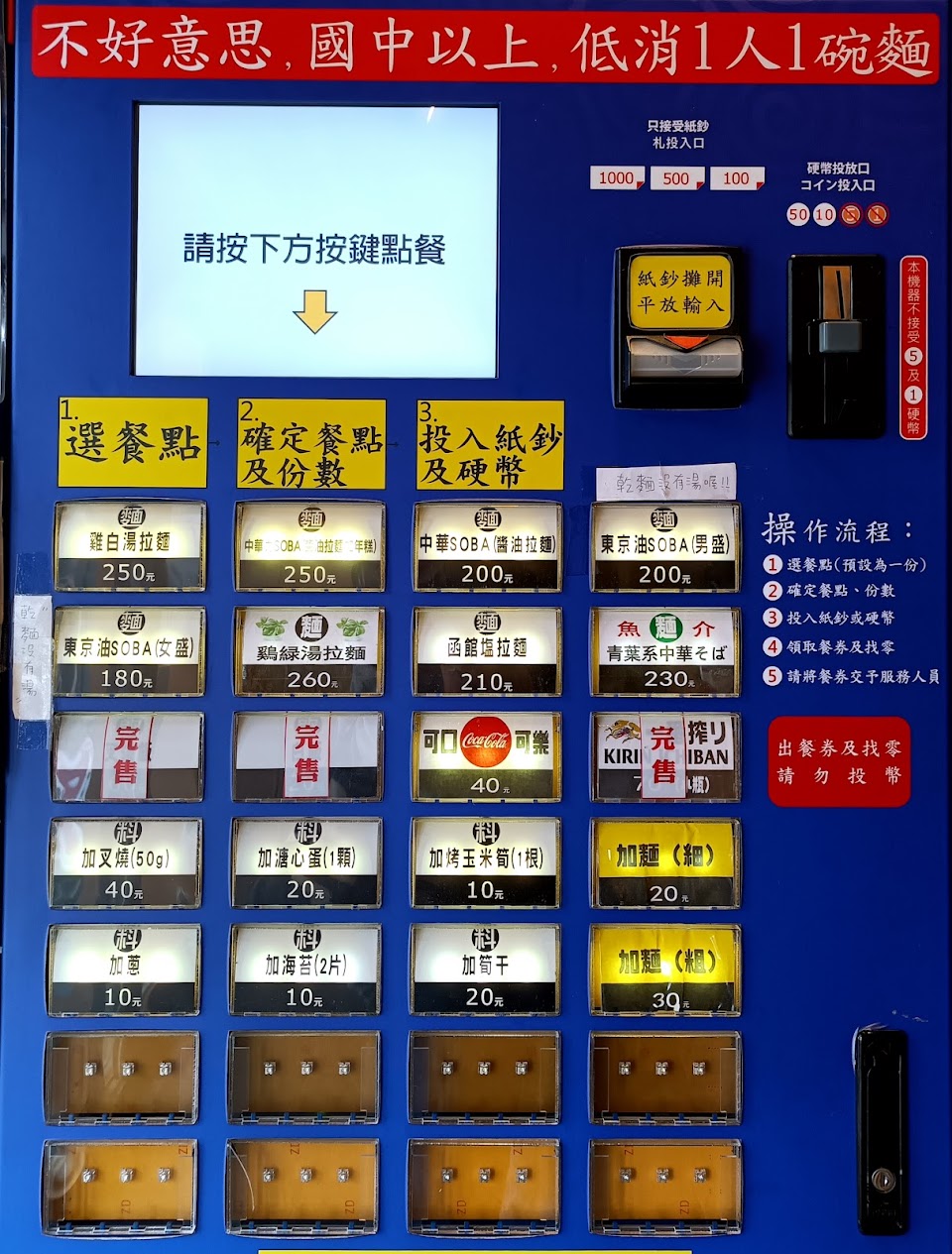 點餐是用自動繳費機,只能用現金支付,然後按餐點按鈕的時候記得長按,不然它不會有動作,不要像我按很多次然後都沒反應?
