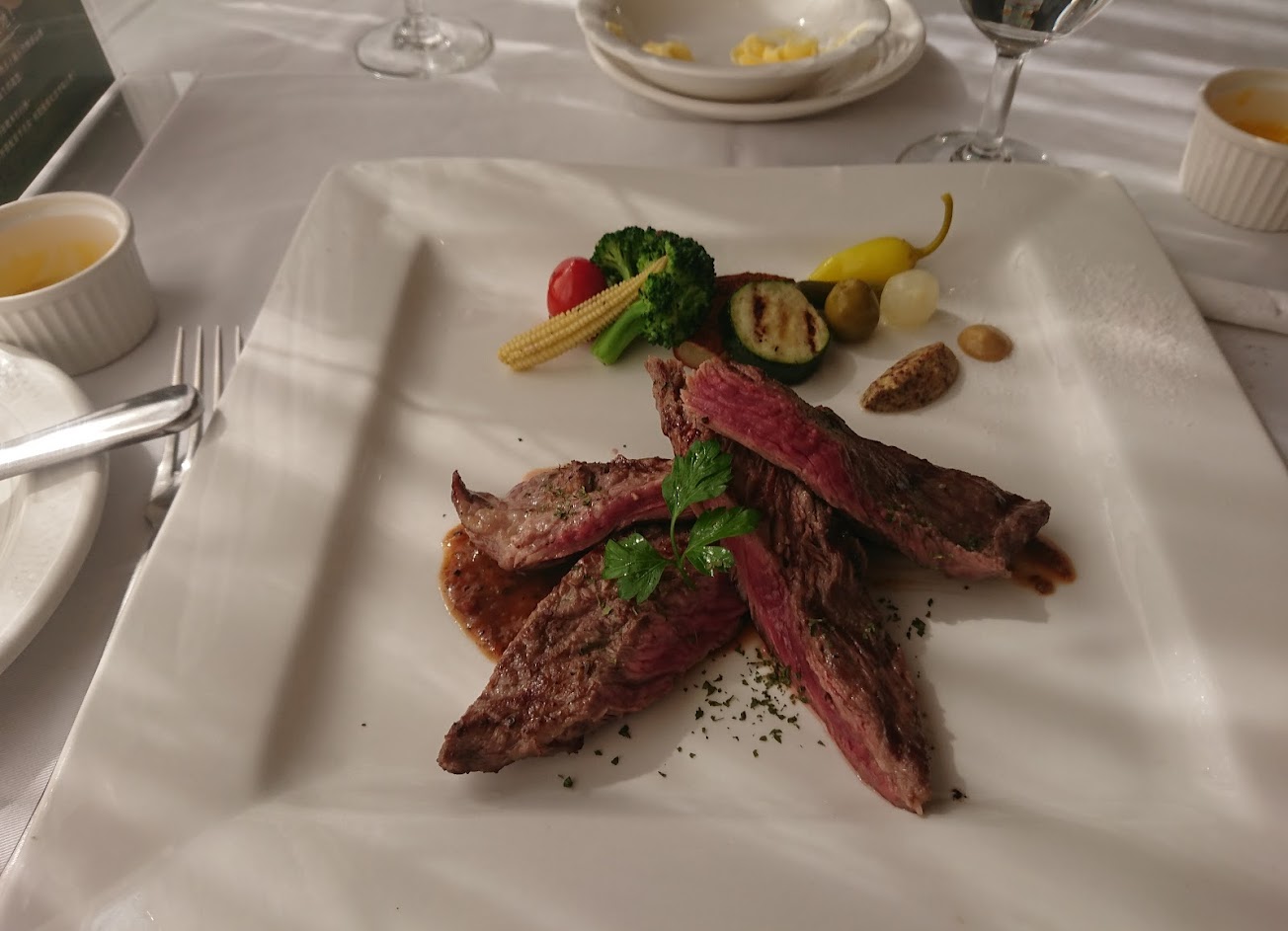 主菜方面 店長很詳細介紹後 先按順紋切一塊 再按逆紋切一塊 待品嚐後選擇喜歡的口感 店長會將主菜排列整齊再給我們享用