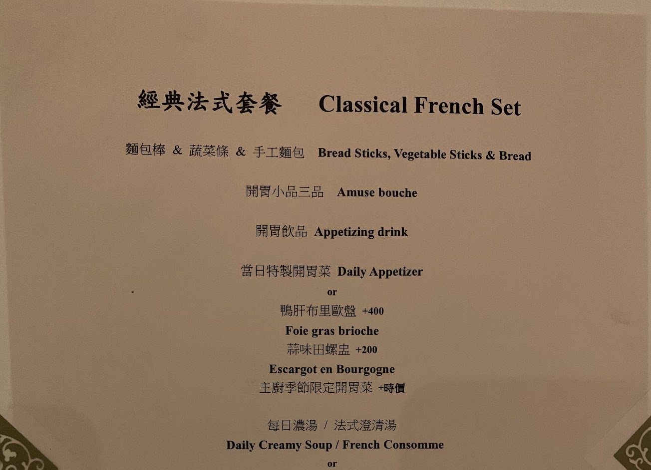 第一次在正統的法式餐廳用餐,很棒的服務,十分難得的體驗。