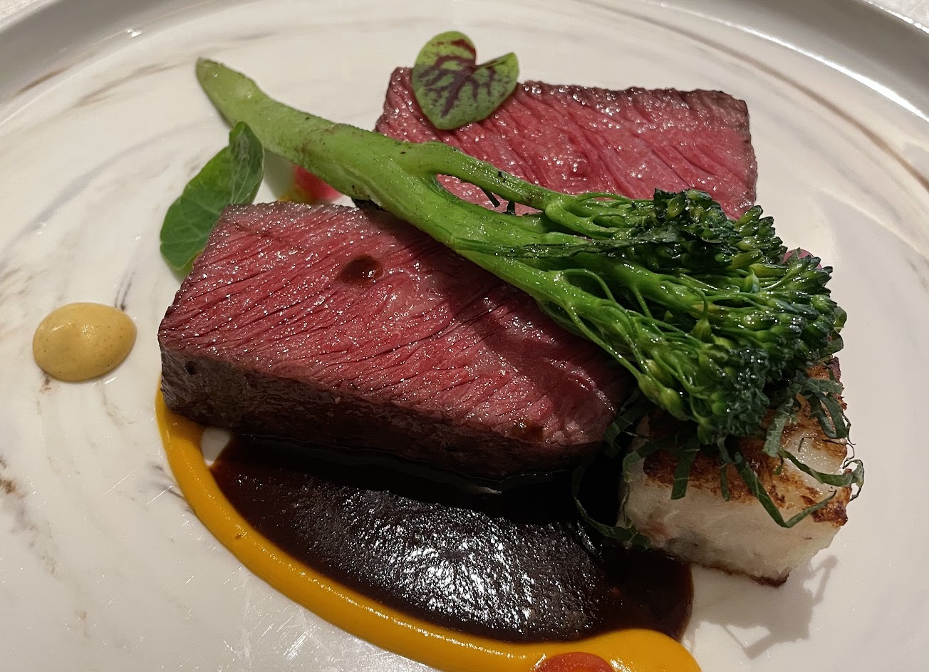 ?紐西蘭鹿肉菲力/豬背脂/胡蘿蔔醬筍醬汁/洛神花/芹菜根泥: