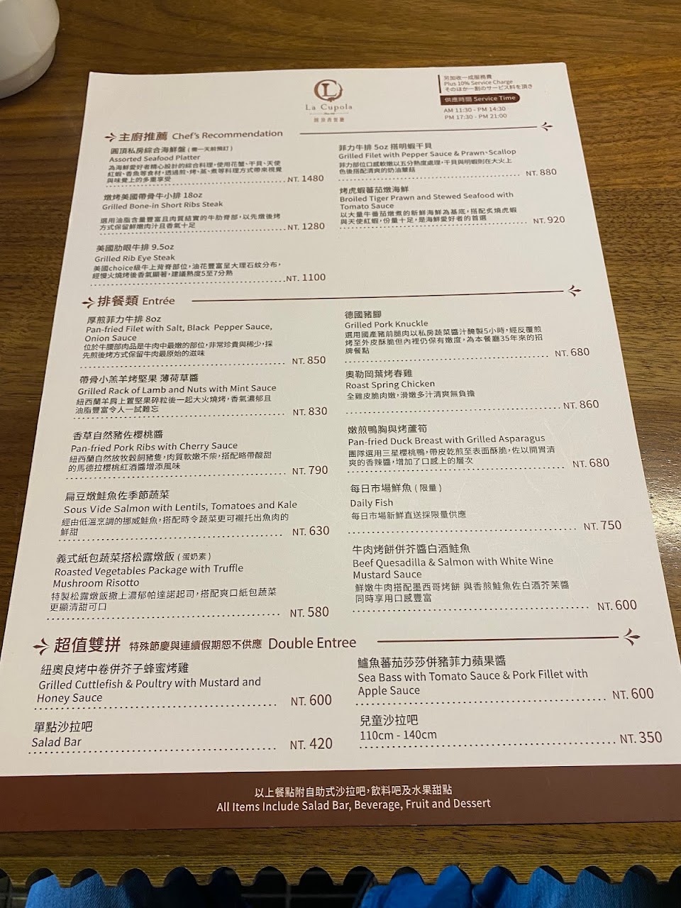 服務一般,不好不壞,並沒有特別突出的記憶點,自助吧品項不多,但菜葉新鮮甜點與麵包因為有烘焙部門似乎選項多些,餐點有調整價格,隨評論附上,德國豬腳表現亮眼!