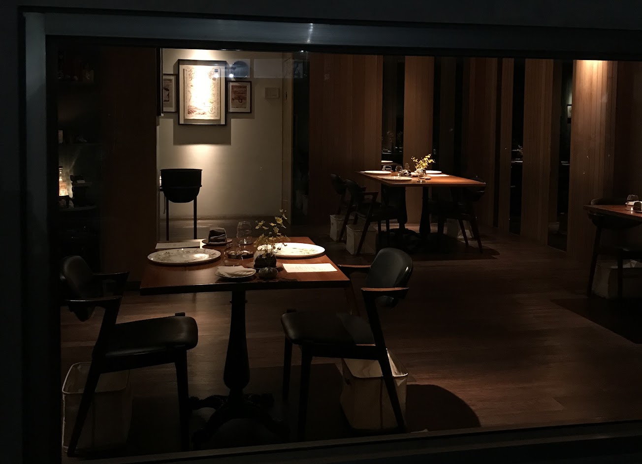 用餐環境介於沉穩、溫和跟素雅之間,跟高級、前衛、創意、或奢華離比較遠;座位不多,雖無壓迫感,但也沒有開闊感,像是在藝廊裡面擺了桌子辦的一場餐會,但沒有桌布,口布也是小尺寸的