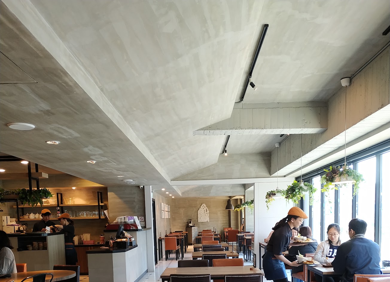 位在前鋒路上二樓,空間很大,可以坐80個人以上。光線很舒服,木頭、假植栽、刷法很舒服的水泥牆壁、參雜些微的工業風元素,播放的音樂是舒服的Bossa Nova。