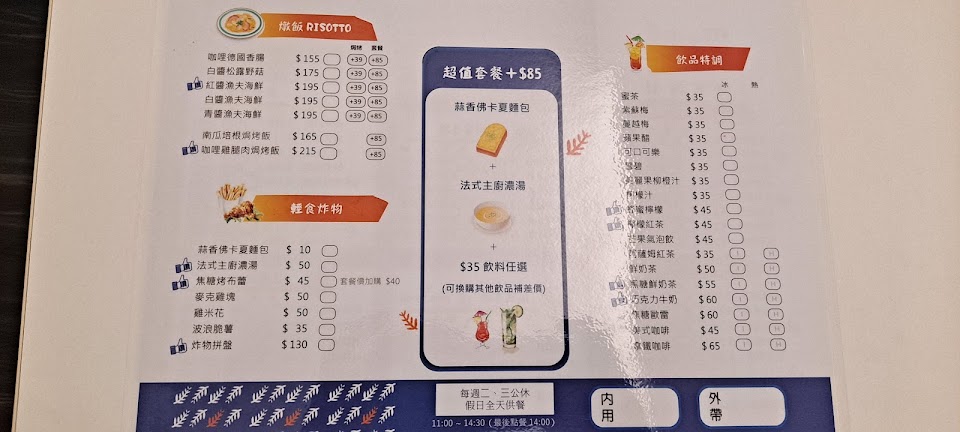 | 星期一 | 11:00–14:30 17:00–21:00 |