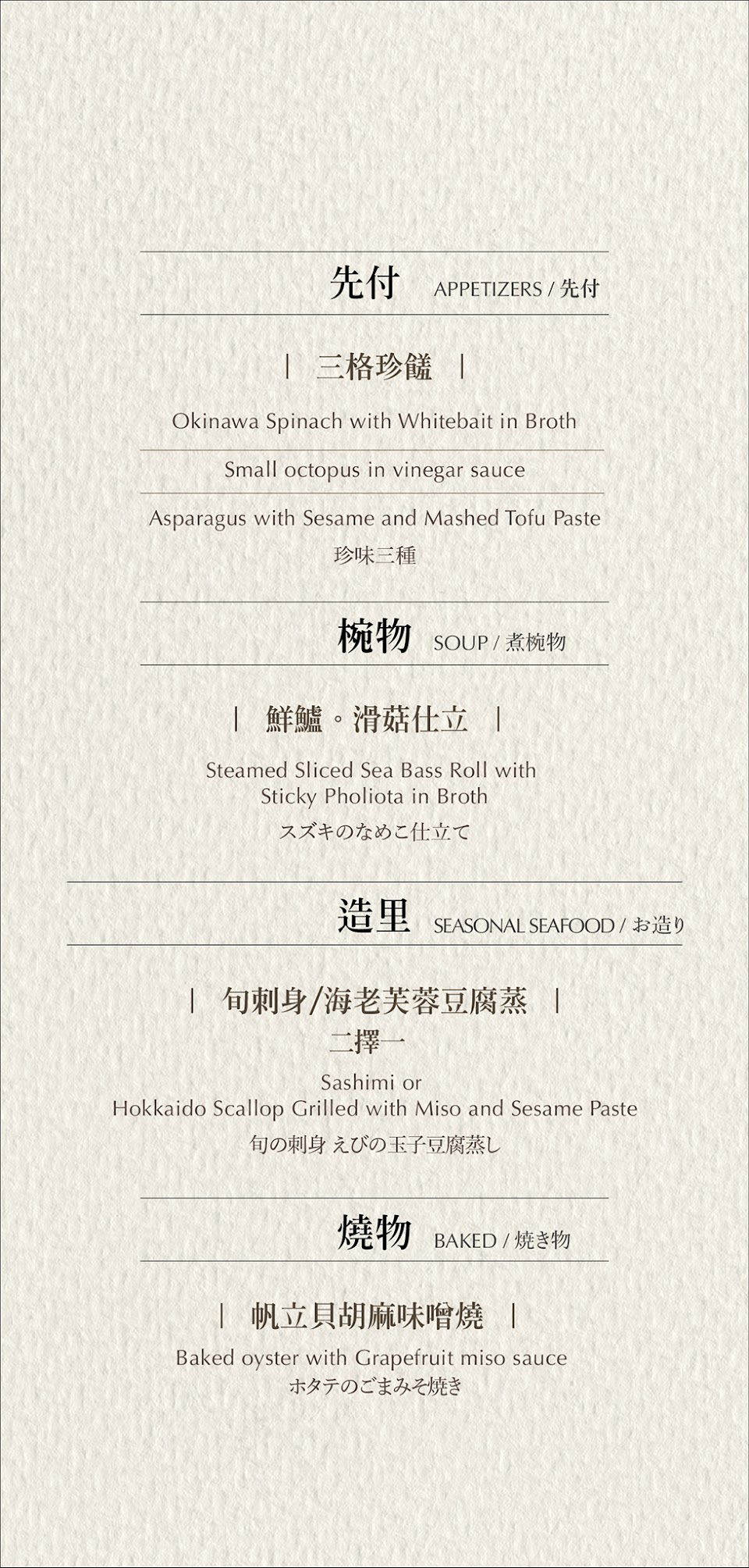 2023/06/17 吃晚餐,用餐方式為點選主餐+享用日系風格buffet吃到飽,還滿喜歡這種形式。用餐環境彷彿來到日本,首先會上前菜三格開胃漬物、旬刺身、明太子烤焗貝,除此之外自助部分也提供許多精緻的開胃菜,放在小碗缽內,可自取木托盤盛放,擺上裝飾的植葉,相當有格調。主菜點了1280元的安格斯牛小排朴葉燒,放在朴葉上炙烤,鋪上櫛瓜、香菇、牛蒡絲,很特別的吃法,附上小巧的3種玻璃鹽罐(柚子鹽、馬告竹鹽、七味蔥鹽),搭配起來提味效果很加分。自助主食有清蒸蔬食、關東煮、炊飯、和風咖喱飯,不怕吃不飽,還有食蔬炸物,以及簡單的海鮮蝦子、淡菜、小章魚等海鮮,甜點區有許多日式小點,手掌燒、磅蛋糕、蛋塔、三色丸子、麻糬、厥餅、手工餅乾、紅豆湯、水果等豐盛小物,冰是靜岡焙茶口味,清新不會太甜膩,咖啡有巴西/瓜地馬拉、哥倫比亞咖啡豆。套餐最後還有附桃子口味的和菓子糕點。一整個用餐路線都充滿日式精緻,品味十足,可以優雅地吃到飽,不會覺得吃到太油膩、太罪惡。