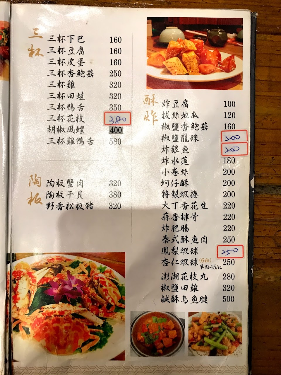 四杯啤酒一起喝, 烤鴨舌, 鳳梨蝦球, 蚵仔酥, 炸銀魚, 夏林超值壽司, 芹菜花枝, 雞肉串, 蘆筍蛤蜊, 魚肚湯 菜粽和肉燥飯, 炸蛋, 桌菜, 烤猪肉, 烤肥腸, 和風海藻沙拉, 炸豆腐, 泰國明蝦, 豆皮壽司, 綜合生魚片