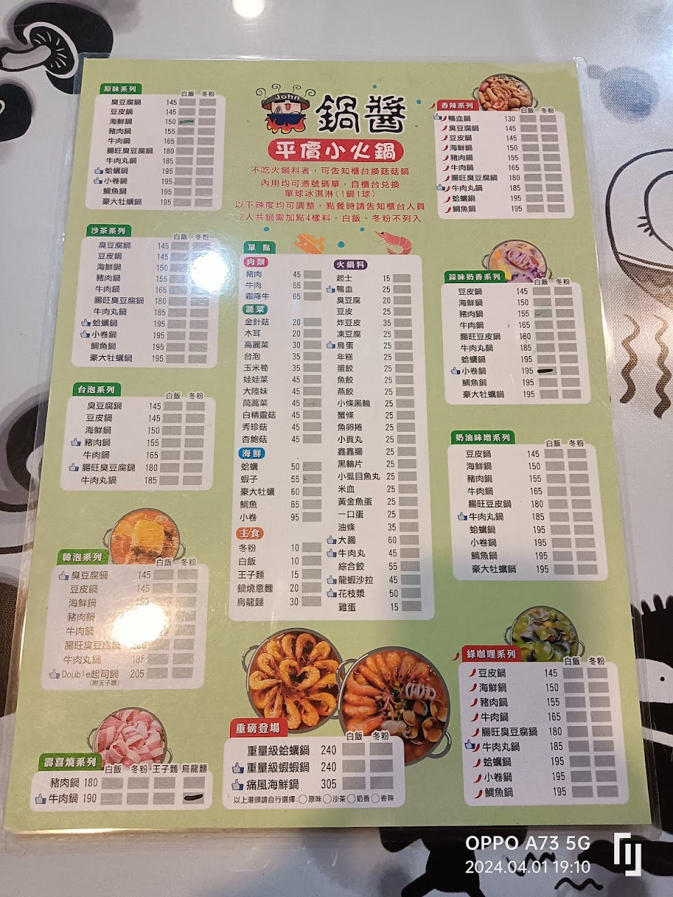 吃過蠻多次的 主要是有一次老闆娘的貼心服務 覺得真的喜歡這家店 其實火鍋種類不少 價位也真的平價 料跟湯頭都很夠味 雖然位子不算多 但畢竟室內煮火鍋還是進去都有味道 建議可裝個空氣清淨可加強過濾空氣品質