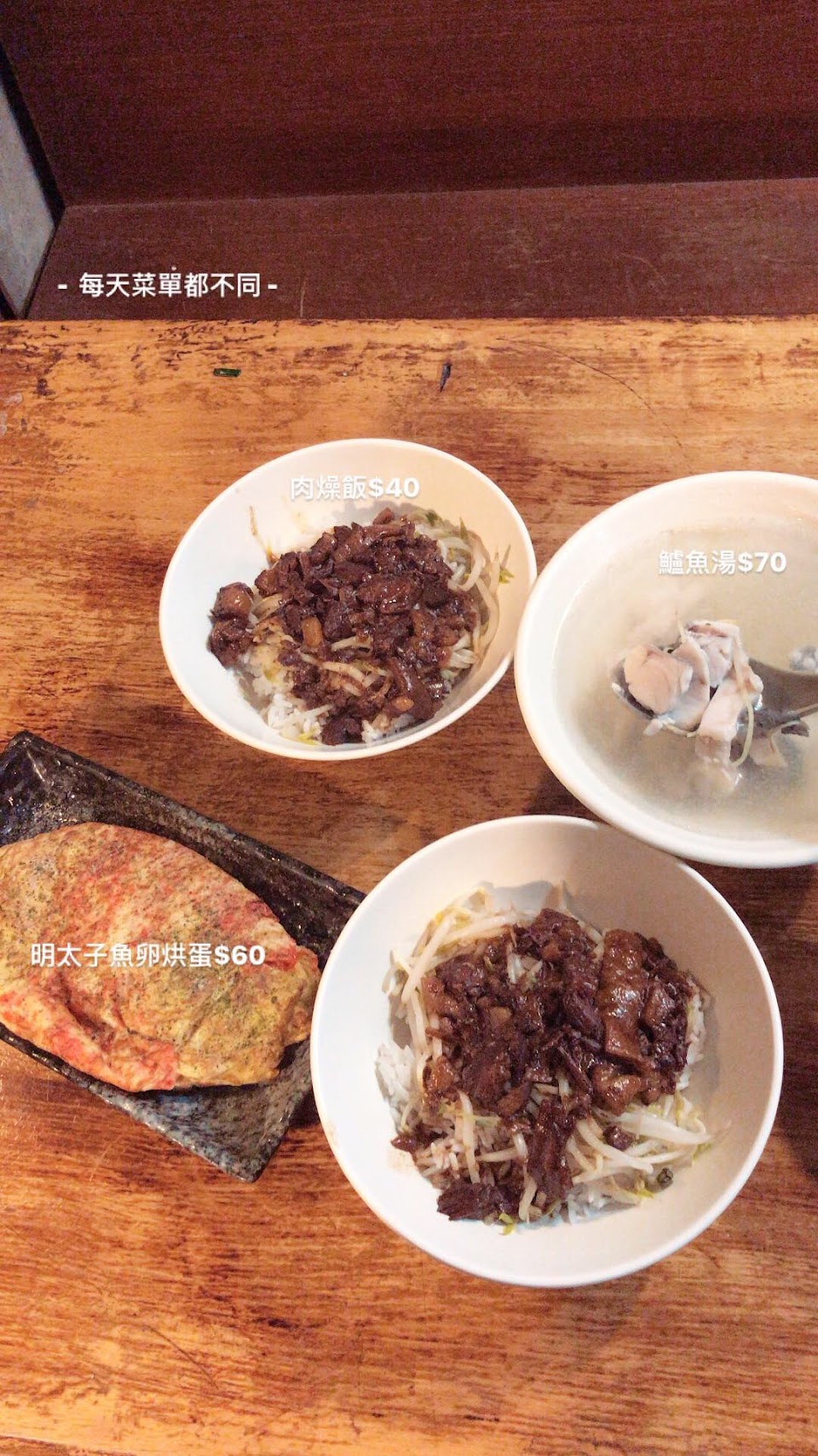 似乎每天有不同菜單,可以兩三個人以上來點不同菜色分著吃,這樣能嘗到比較多種。今天吃到煎蛋燒、蔥爆豬肉、炸排骨。口味都還不錯,豬肉口感再嫩一點個人會比較喜歡。有機會再來試試看炒飯類的。