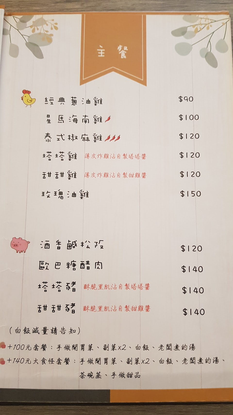 原味燜煮雞, 蒸蛋, 筍子湯, 小菜, 甜甜雞, 椒麻雞, 塔塔雞, 湯品, 塔塔薄皮炸雞, 川味雞, 手工泡菜 嫩炒蛋, 茶碗蒸, 泡芙