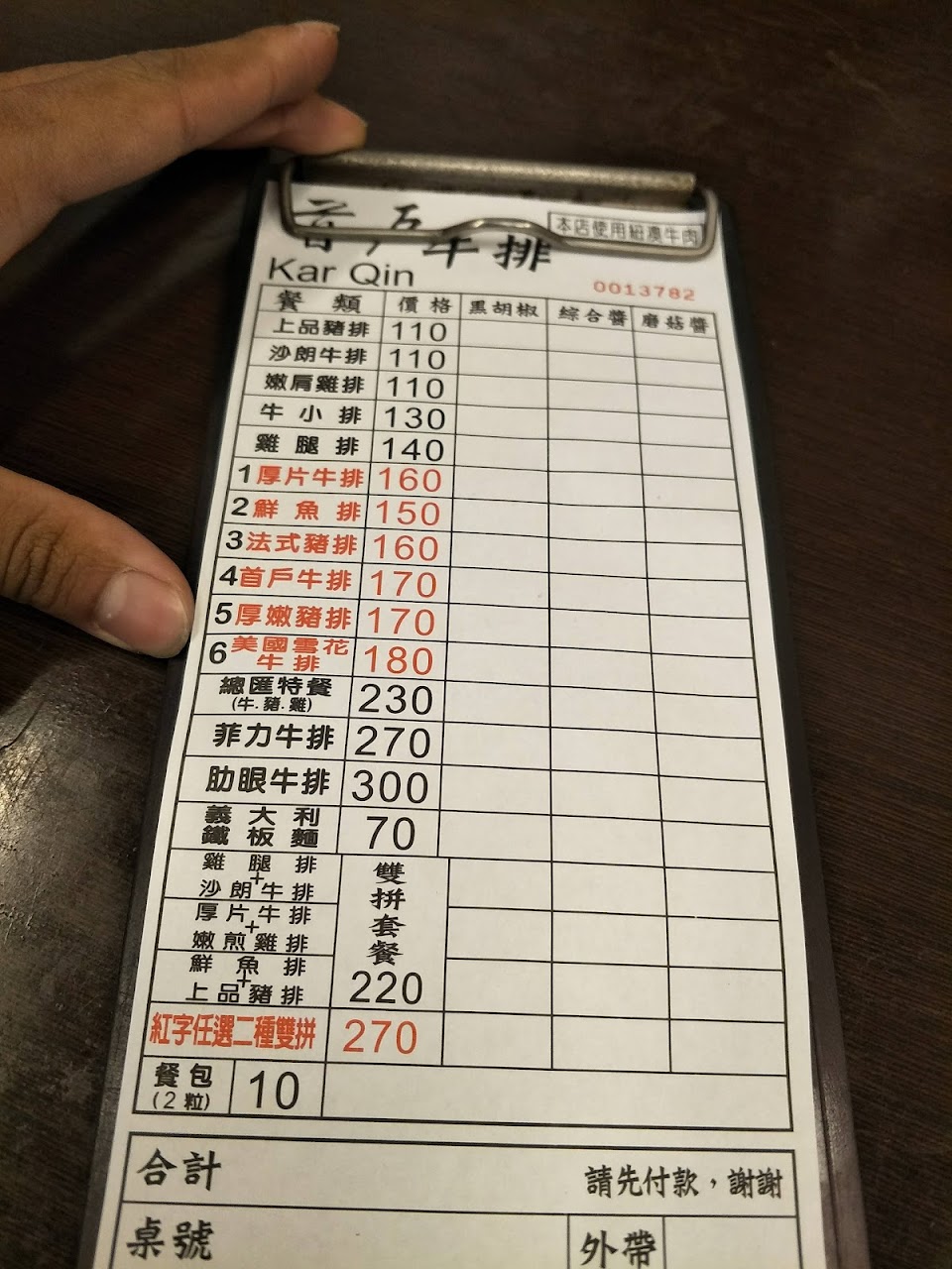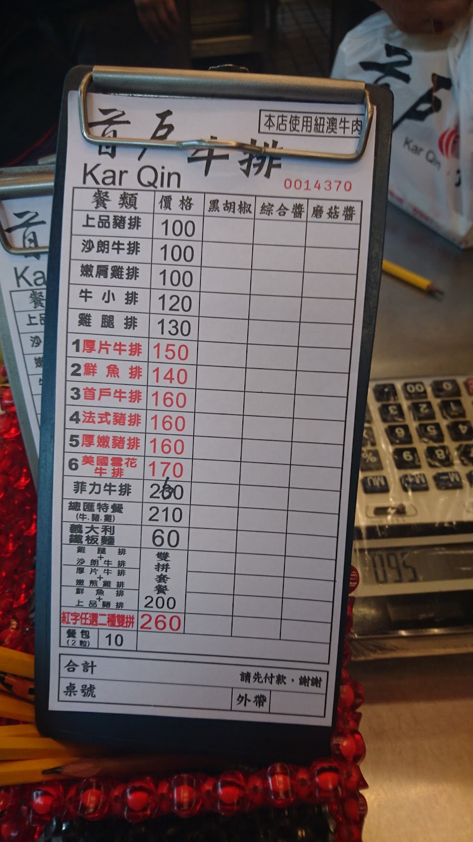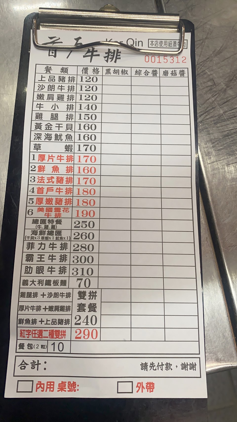 今天外帶一份黑胡椒厚切牛排,並畫菜單給他們!當下也有再次提醒大姐是黑胡椒口味!
