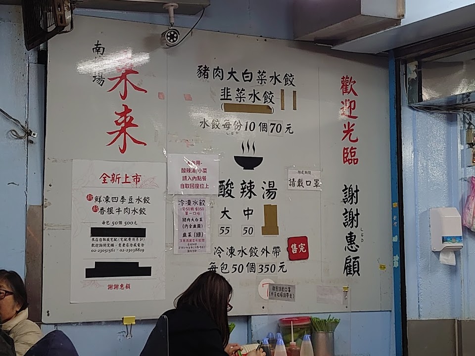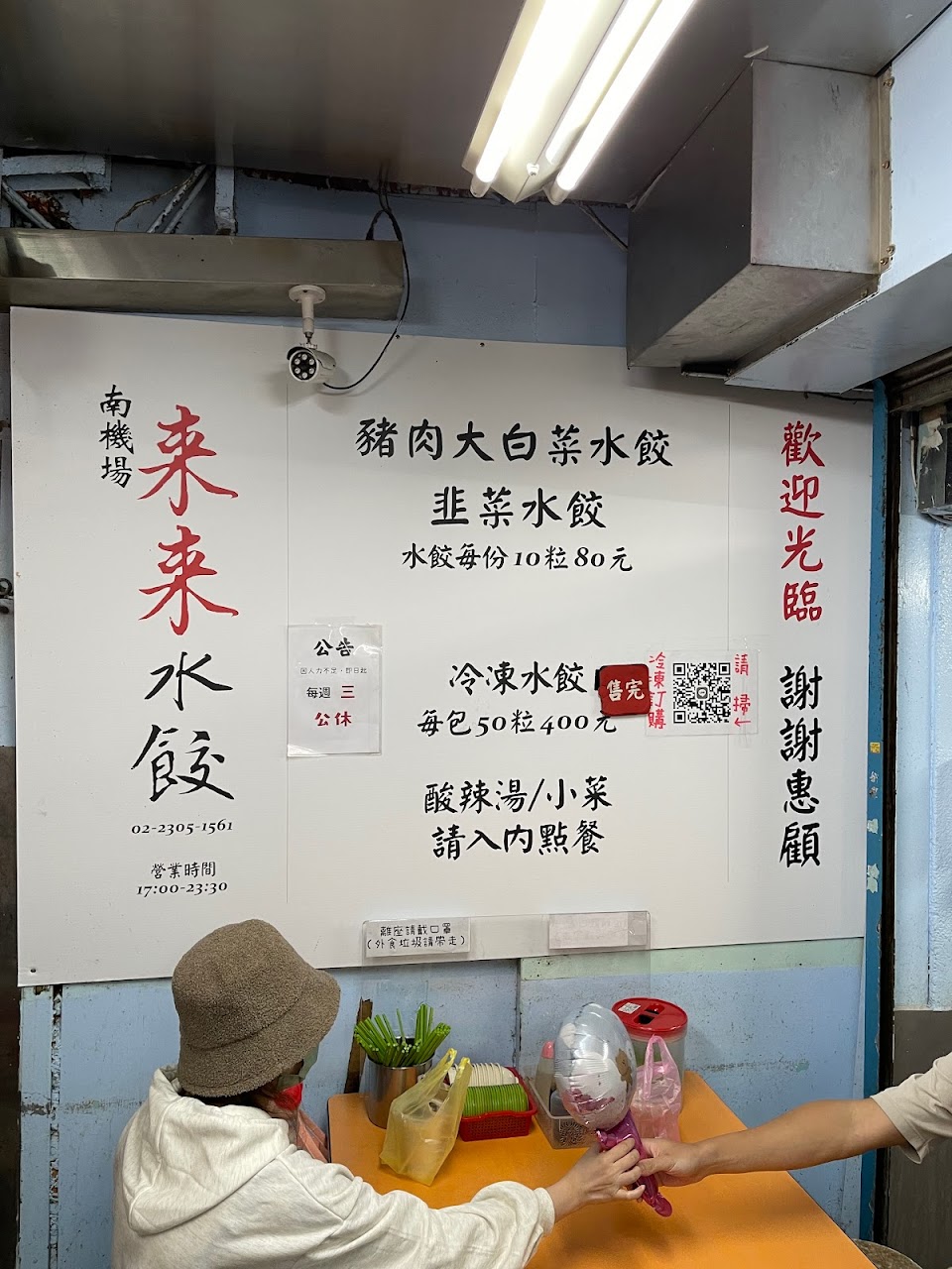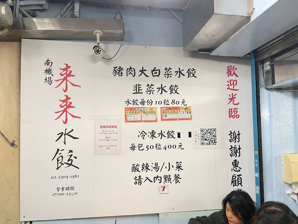 ? 點餐程序:在入口的告示牌 ? 旁邊排隊 (請見照片),會有服務生人員來訊問你要幾顆水餃 ?,輪到你時會告知你坐幾號桌。水餃一顆八元,點餐以五顆的倍數為單位。如果沒有特別告知什麼口味,一律會給你豬肉白菜水餃 (我本來要點10顆豬肉白菜,5顆韭菜,結果當我發現點餐規則時已經來不及,小姐已經幫我點了15顆豬肉白菜)