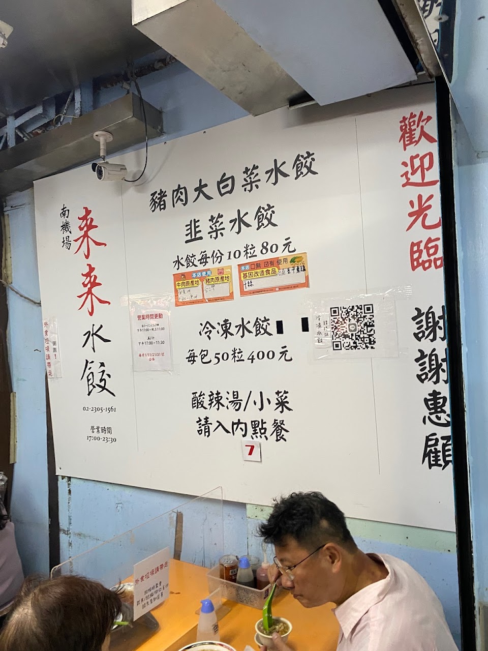 第一次來南機場夜市~ 聽說必吃的來來水餃! 整間店客人坐滿滿的 外面也很多人在排隊等待 若是同行的人比較多就會拆桌坐 等剛好有一起的位置會問要不要併桌坐
