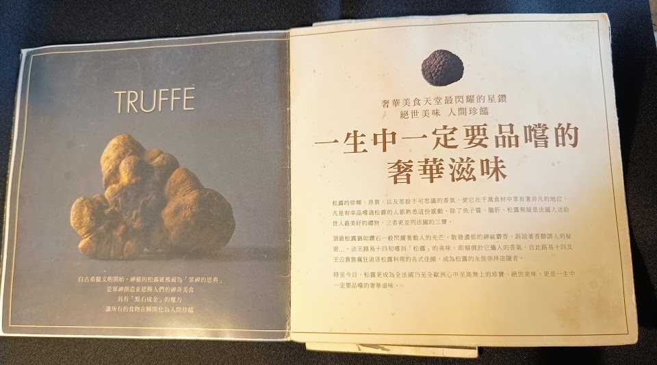 來這裡的確是可以好好品嚐到松露的味道,有多種不同層次帶出松露的特別,價位看個人,也許會讓人覺得這樣的環境與服務並不值,但若以法式料理及料理的特殊性來說是可以接受的。