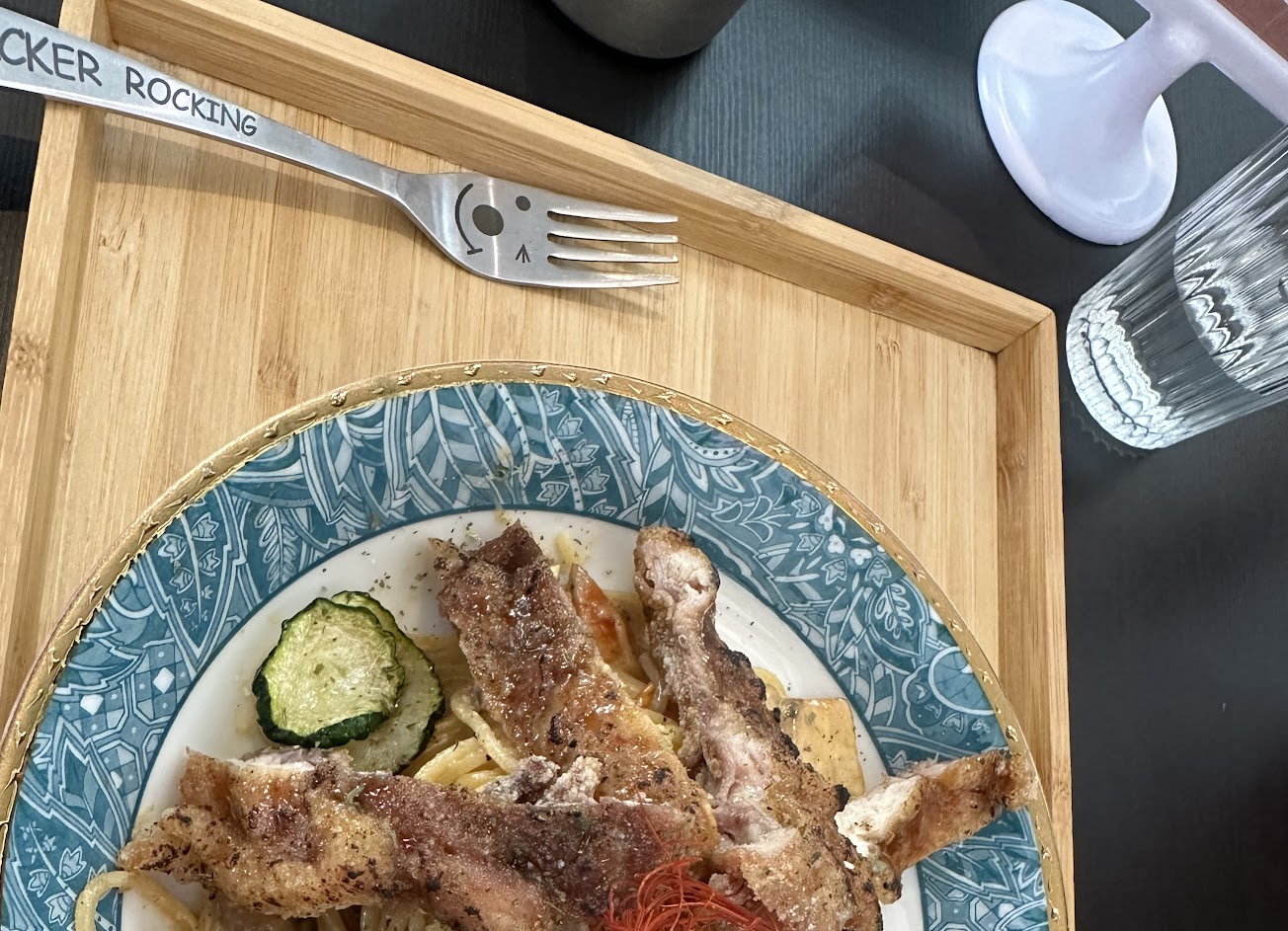點了小卷跟烤雞,都好好吃。清炒義大利麵也非常香又彈牙!店狗也太可愛了吧