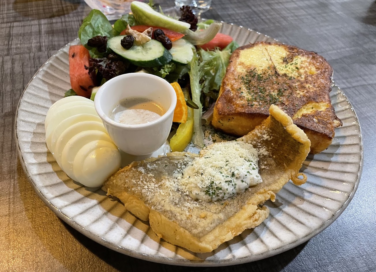 晚點:法國吐司軟嫩微甜,雞腿灑上帕瑪森起司,並貼心的分切好,對於要照顧狗狗的客人,叉子叉了就能吃非常方便~