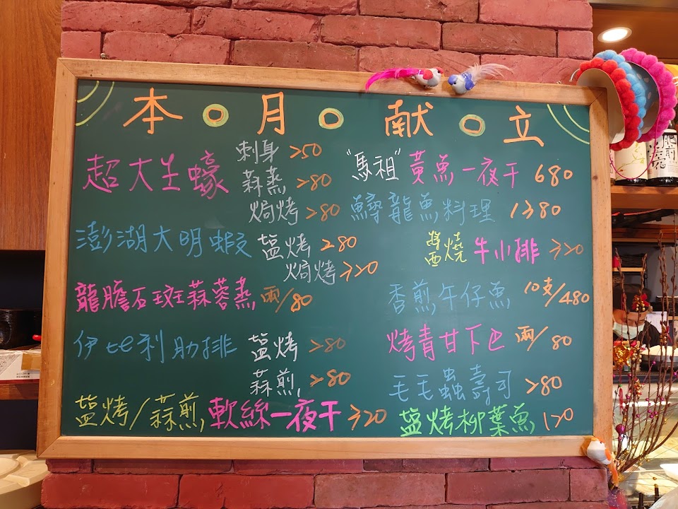 軟殼蟹壽司, 炸蝦天婦羅, 炒水蓮, 清蒸鱘龍魚, 明蝦料理, 鹽烤母香魚, 海膽鮭魚花枝刺身, 鯖魚套餐, 牛肉塔塔企, 軟骨佐芋頭, 生魚片 定食, 龍蝦火鍋, 生魚握壽司, 戰斧羊排, 雞肉養生菇鍋, 波士頓龍蝦, 麴烤蝦, 雞腿香腸拼盤, 豪華海景丼飯, 單人綜合刺身