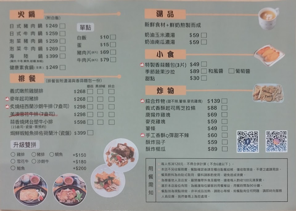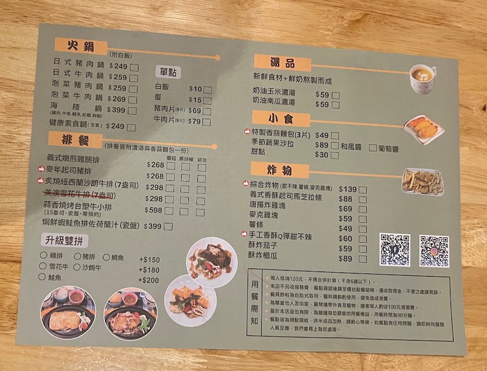 綜合炸物, 泡菜豬肉火鍋, 義式嫩煎雞排奶油燉飯