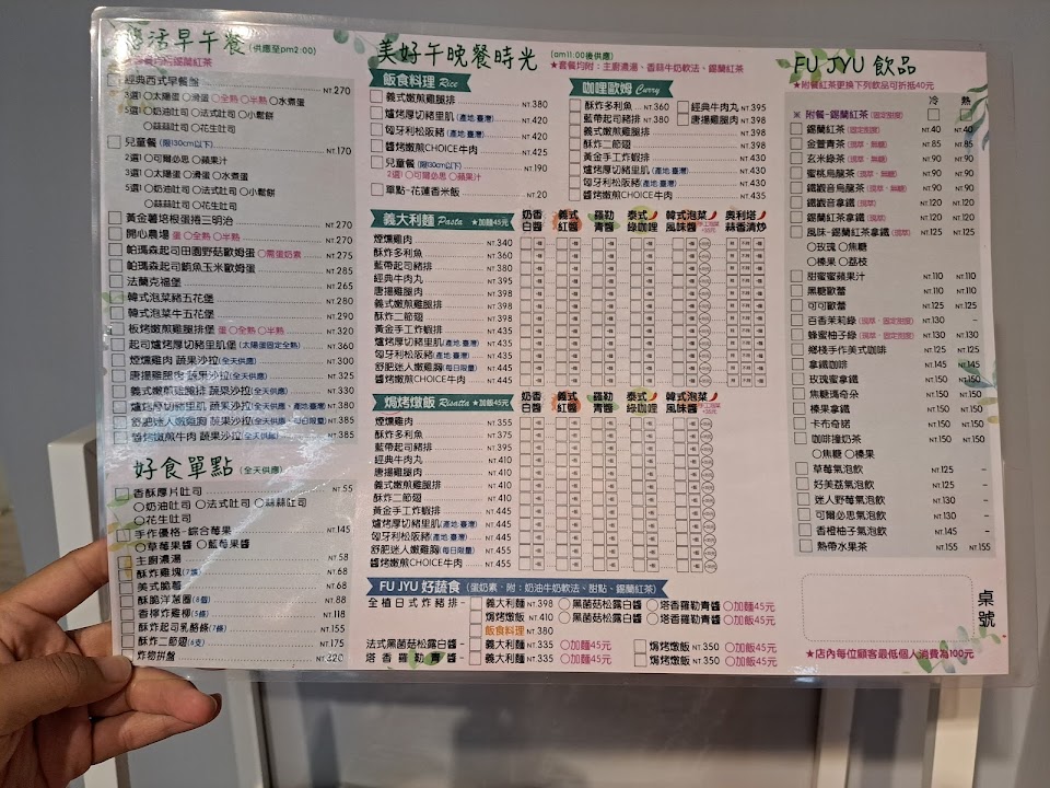 投票完和妹妹來家附近的餐廳用餐,一直以為福聚是賣午晚餐,google後發現沒想到連早午餐都有賣。我點了經典的西式早餐盤,選了全熟的滑蛋跟蒜蒜吐司,妹妹則點了黃金薯培根蛋捲三明治,我們一致覺得早午餐的部分非常好吃,而且份量超大,她的三明治沒吃完,甚至還打包,以270的價格來說,真的非常實惠,下次會打算來試試別的餐點。美中不足的部分是,可能因為假日又是投票日,店裡面有很多兒童,聲音稍嫌吵雜。