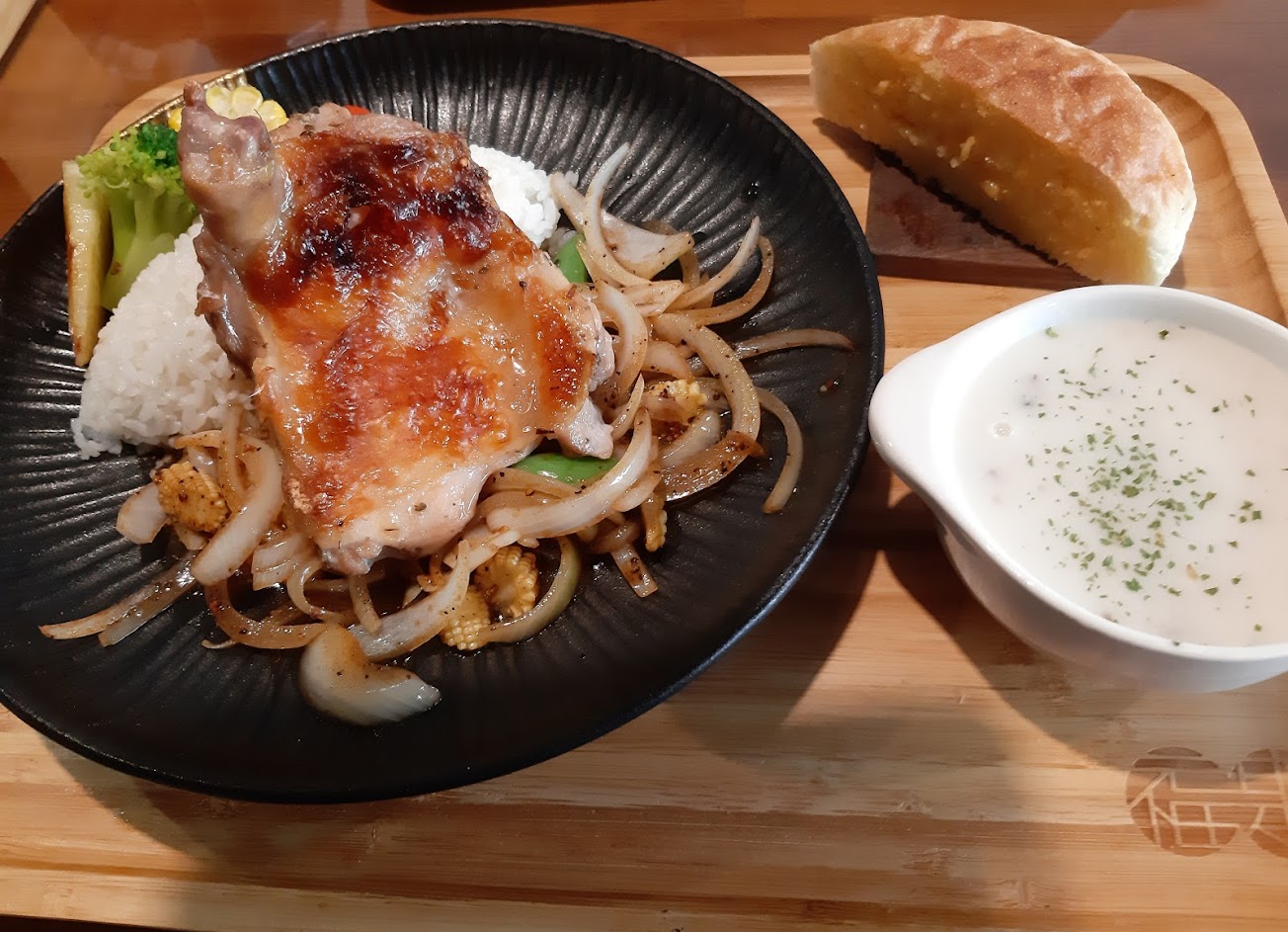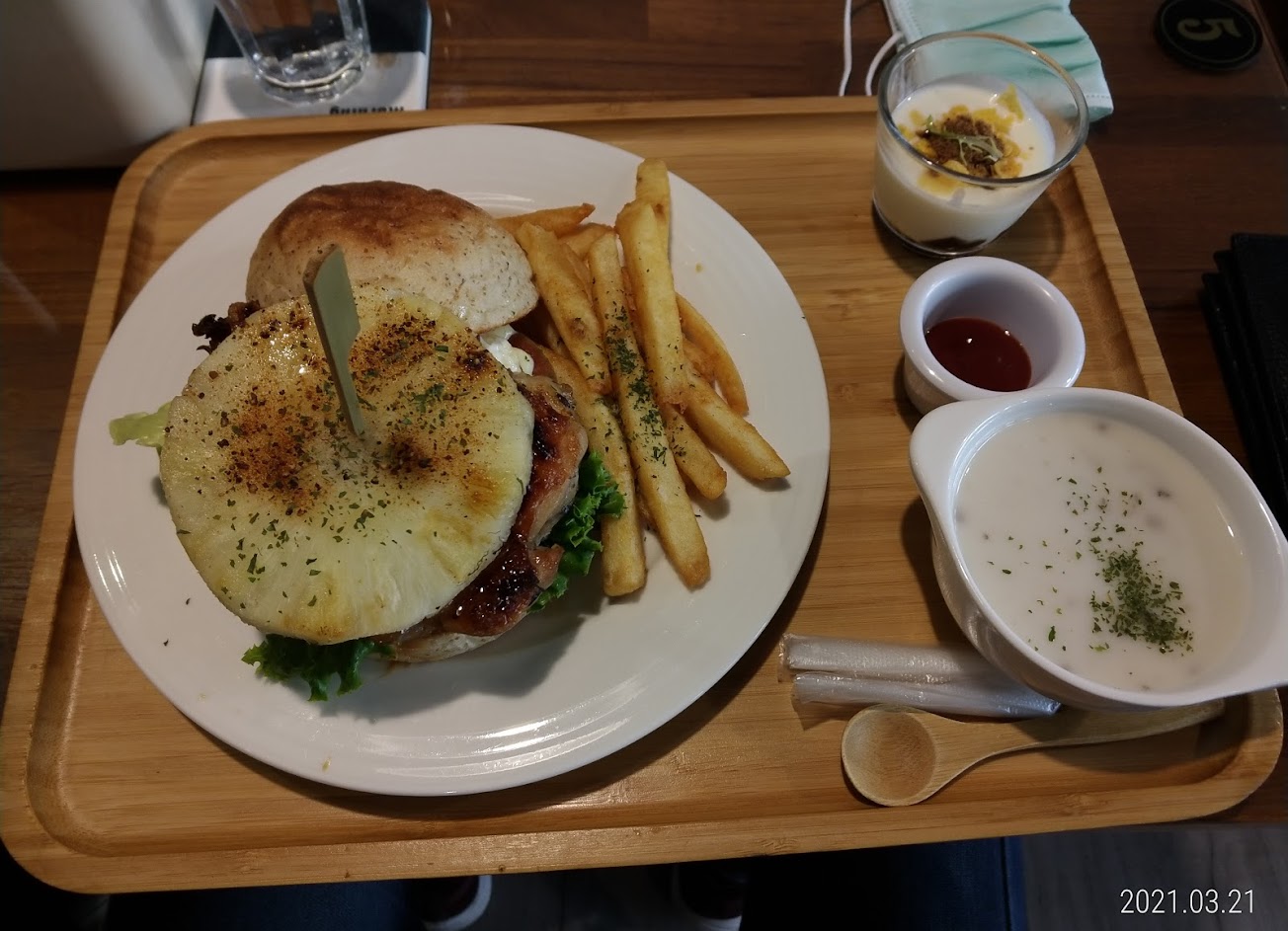 ?️餐點都會附上一杯固定甜度的錫蘭紅茶,可以調整冰塊。午餐餐點的義式雞腿排煎的恰到好處,旁邊的小菜也不錯吃,還有附湯。早午餐的經典西式餐盤內容物有滑蛋.培根.菌菇濃湯.優格杯.薯條.吐司(有四種可選).一小碗沙拉,內容物算是非常豐富。漢堡類有附手套,吃起來會有點狼狽,在意的人可以謹慎挑選一下。