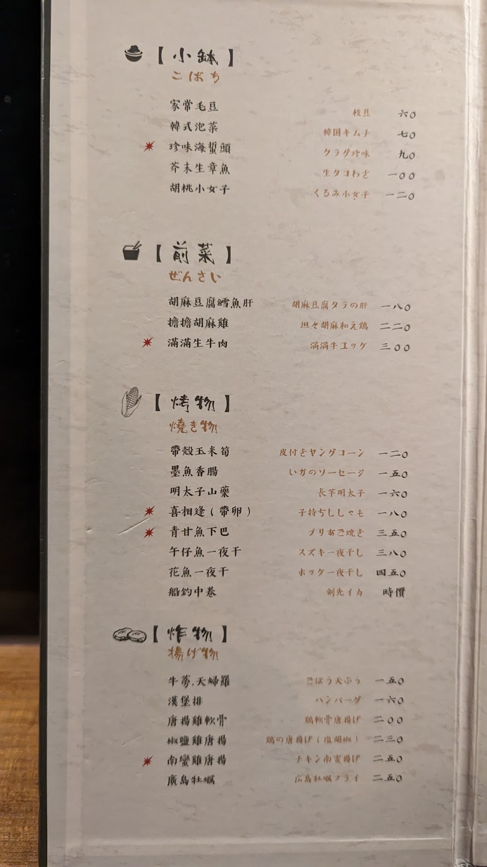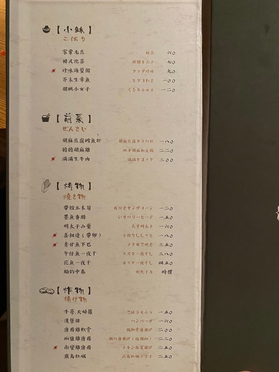 位在徐州路上的居酒屋。食物相當美味,不論是串燒、炸物或烤物都相當出色;沒有刺身。特別推薦他們的綜合野菜天(180元)、墨魚香腸(150元)、烤櫛瓜(50元)。用餐環境乾淨舒適,燈光很有設計感,服務周到,氣氛悠閒。平日晚上生意不錯,建議提前訂位。價位是臺北市居酒屋行情,均消約1000元。整體而言用餐經驗極佳,是和朋友聚餐小酌的好選擇,值得二訪的居酒屋。
