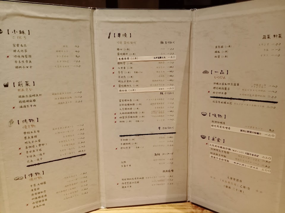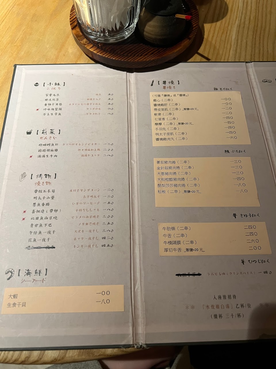 隱藏在徐州路上的居酒屋?,隱密的招牌看不出是間餐廳。串燒、南蠻雞、鮭魚炒飯均在水準之上。但桌子較小,座位較擁擠,比較可惜。另外,因是點餐制,要留意店員有沒有點錯。