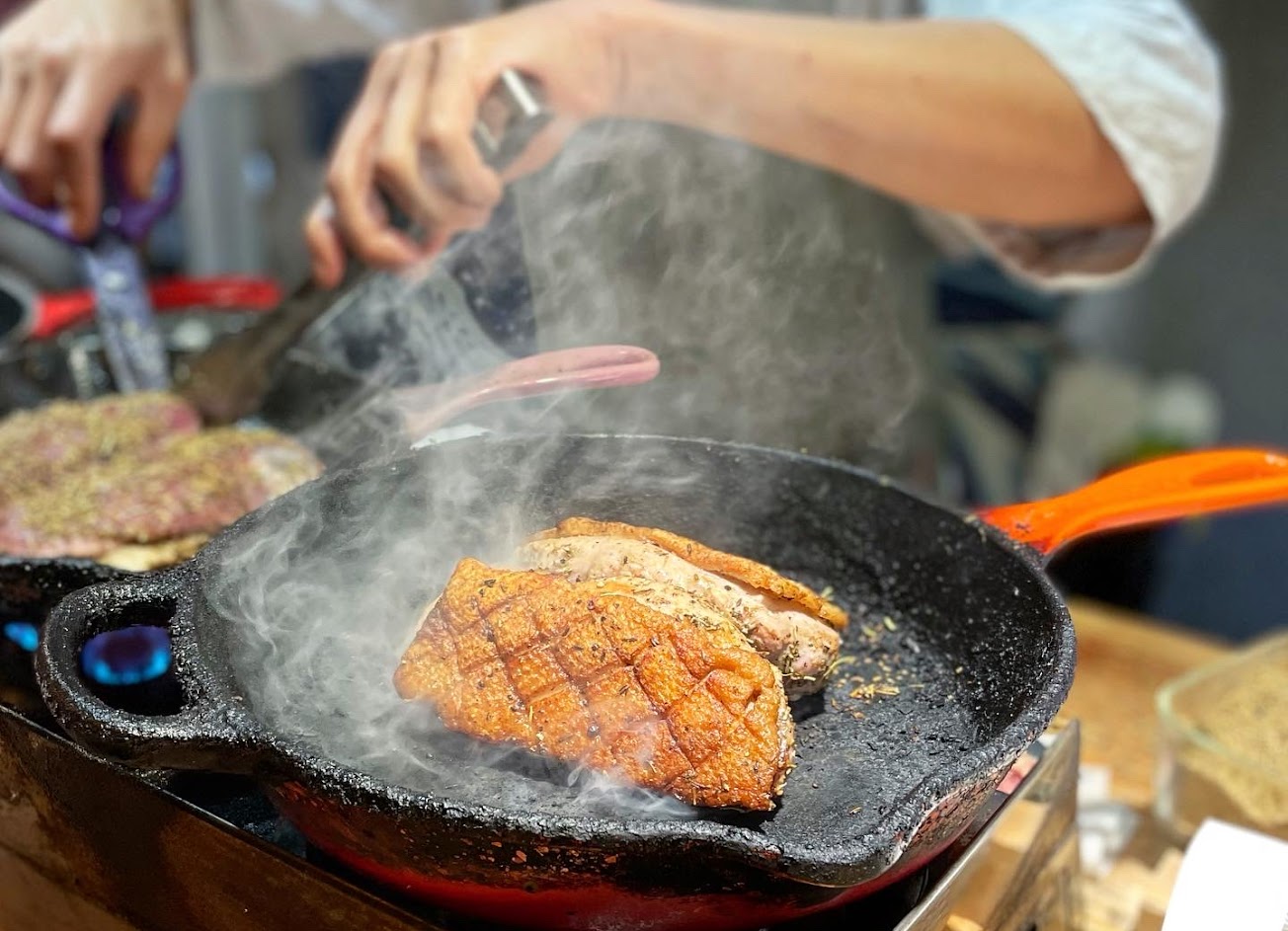老闆煎鴨胸像在主持電視購物 下鍋、翻面、嗆鍋 都會引導客人拍照、慢動作錄影