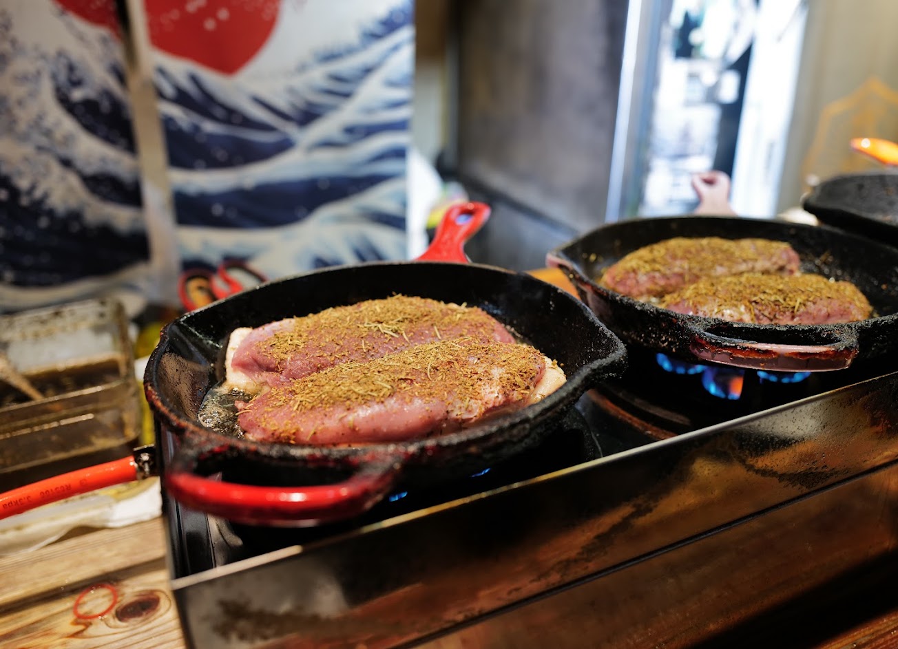 2.板前料理,鴨胸在煙霧中滋滋作響,香味四溢。