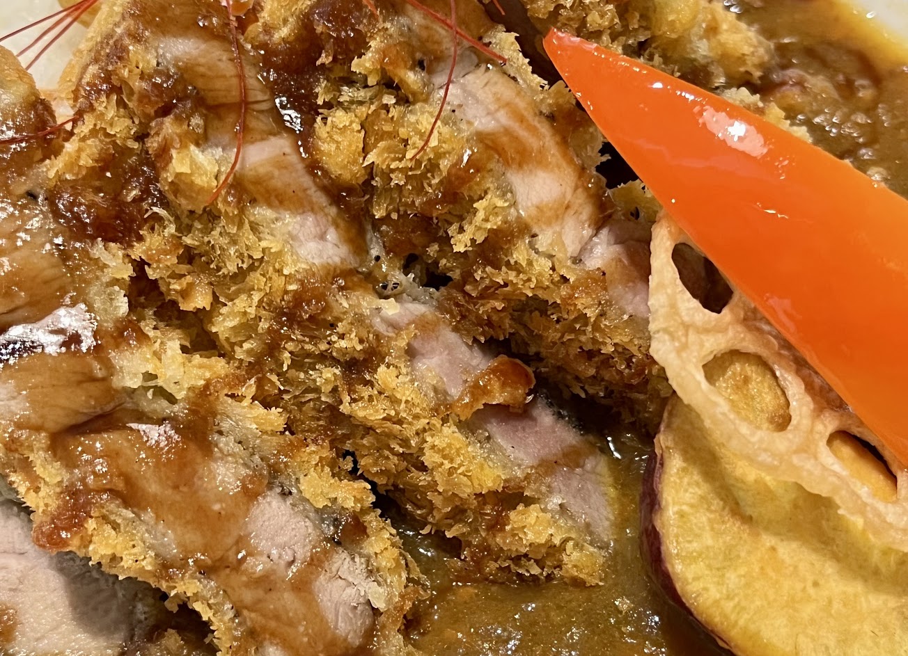 111年10/10 國慶日開幕的日式咖哩店,10/12 Google map地址變動為這,實際店址在台南女中附近,店內承襲舊店(克萊食-永久停業)工業風,空間寬敞但桌椅擺放不是很得宜動線不便,有冷氣和廁所,店員客氣有禮,但畢竟新店服務人員應該多介紹些,這部分也是缺乏 店內使用QR code電子點單(電子菜單上的說明過略,像套餐有啥?單點咖哩有湯?菜單上沒說明),但無法使用變成人工點單 #炸蝦咖哩套餐 上桌擺盤靚,但有感咖哩醬不夠,咖哩醬特殊的部分是富含肉末,但味道上較一般的甜帶鹹咖哩醬,米飯粒粒分明口感偏硬很搭咖哩醬 炸蝦3隻,麵皮和蝦味無分離感,但蝦肉感覺醃製過鹹少了蝦的鮮甜,所以入口有蝦肉過鹹麵皮偏淡配上咖哩的甜,味道上我不適 配菜和炸時蔬皆很搭咖哩醬,但咖哩醬份量不足,大概僅所有食材加上半份飯就會用完 隨餐湯品,清淡口味的蔬菜湯,不錯