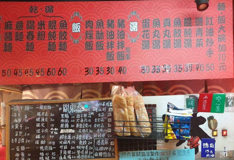 關東煮, 豬油伴飯加蛋, 乾意麵, 魚酥肉燥飯, 滷味
