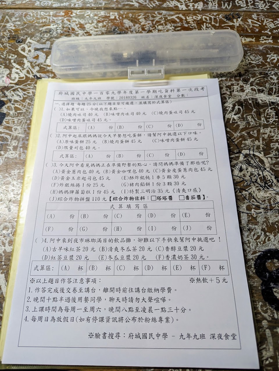 一個很有氣氛的一家宵夜店 座位不多,是國小課桌椅的樣式 不過由於是戶外所以沒有冷氣很多蚊子 菜單很特別 是考卷造型 餐點的選擇沒有很多,但上餐速度蠻快的 ?燒肉吐司 是瘦的裏脊肉,不會很乾柴,其實就跟味噌豬差不多的東西,但個人比較推薦點這個,如果沒有特別愛吃肥肉的話