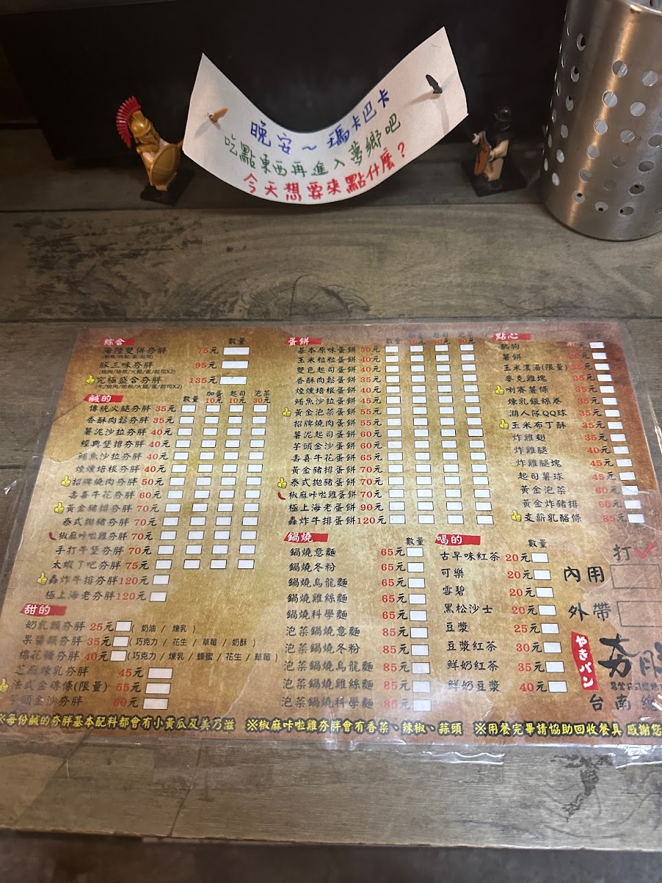 夯胖附近汽車真的非常難停,已經凌晨一點左右依然一位難求,店內座位是學校用的課桌椅很有趣。