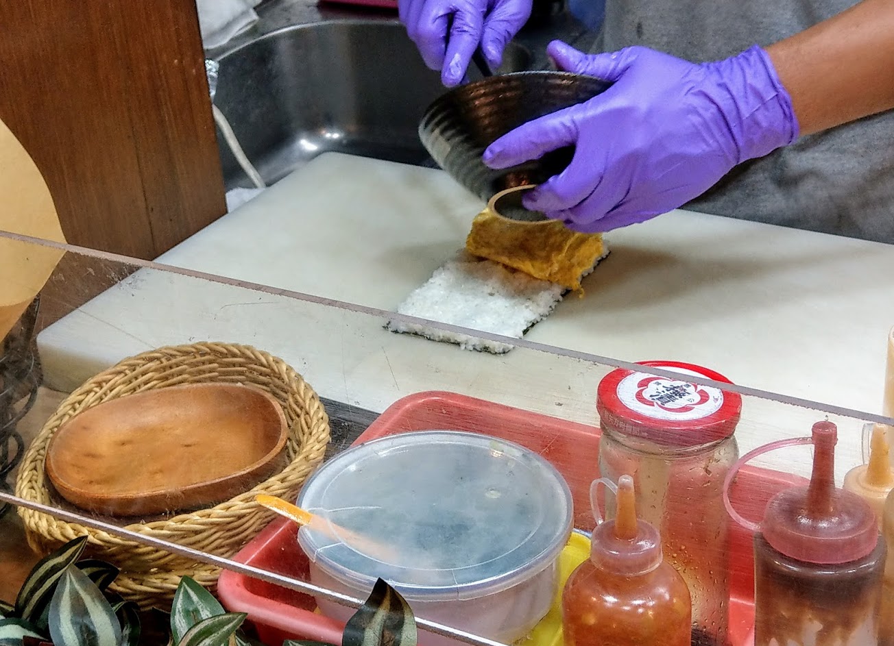 前兩天買了一個胡麻豬排飯糰,味道不錯份量也十足,吃一個就跟吃便當差不多了,CP值蠻高的;但比較不ok的是衛生問題,戴著手套做任何事,收錢找錢拿東西…然後再來包飯糰…這真的需要改善…